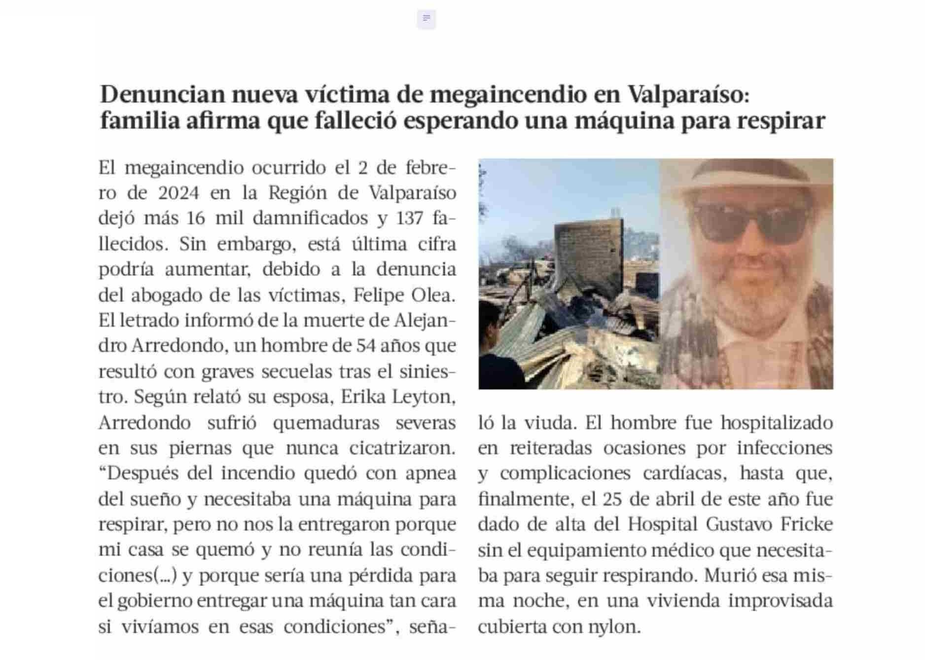 Denuncian nueva víctima de megaincendio en Valparaíso: familia afirma que falleció esperando una máquina para respirar