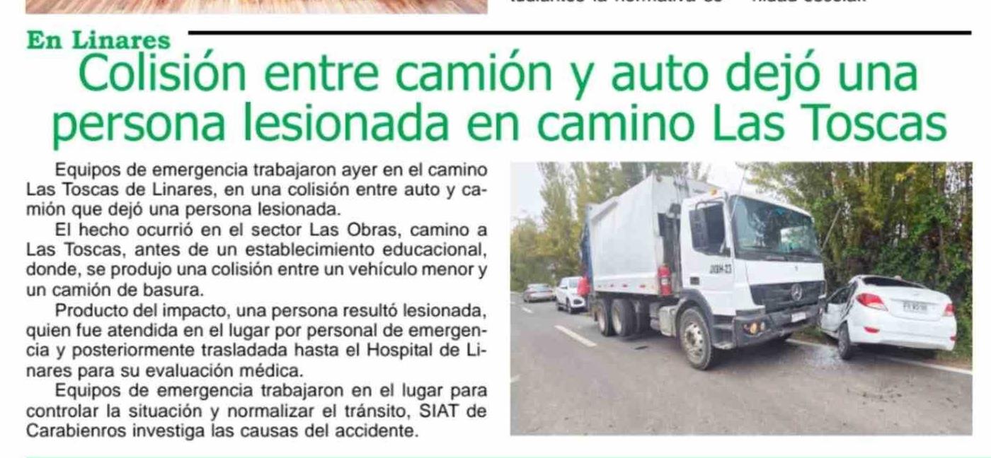 Título: Colisión entre camión y auto dejó una persona lesionada en camino Las Toscas