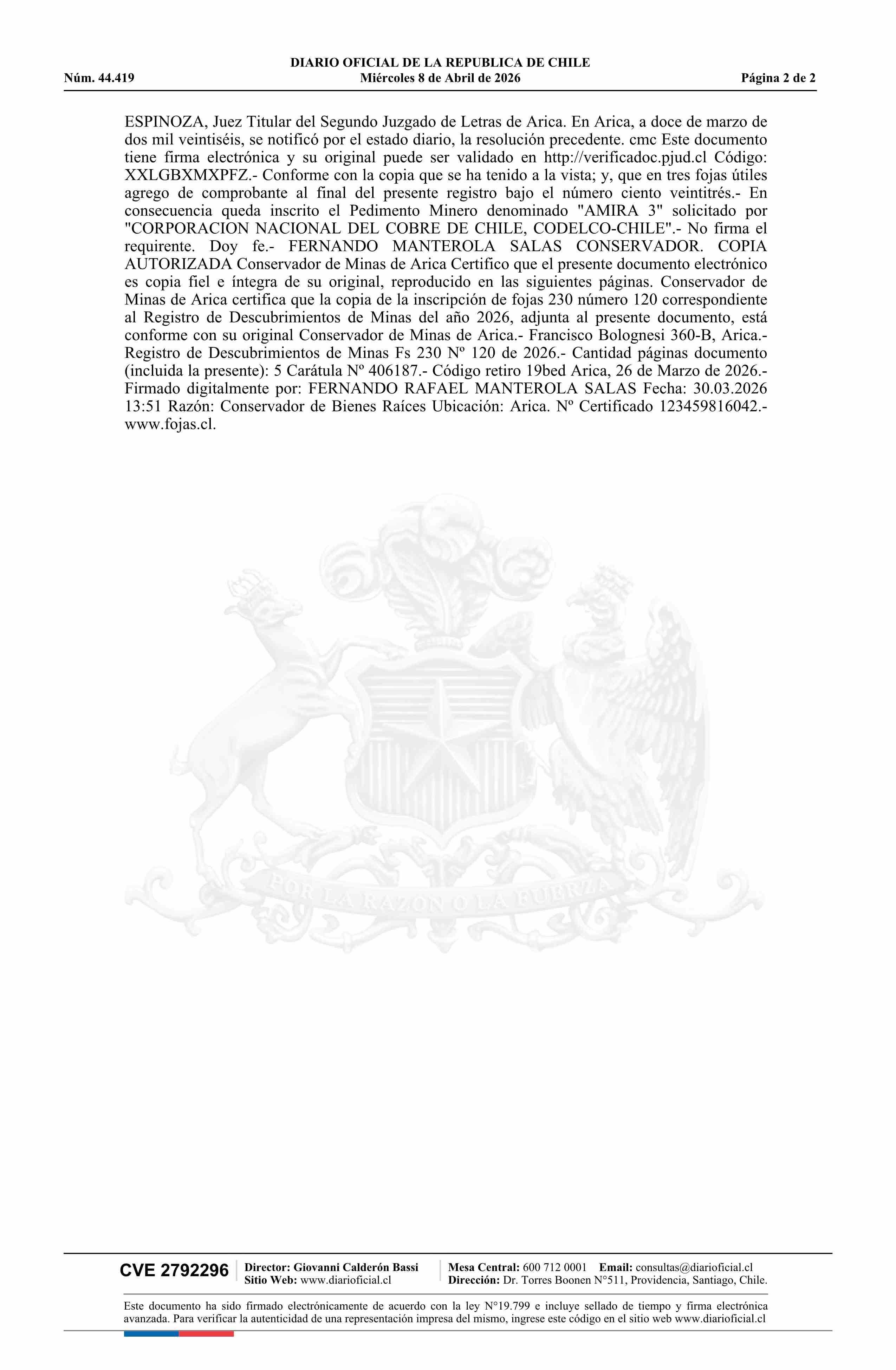 DIARIO OFICIAL CHILE - BOLETÍN OFICIAL DE MINERÍA (DIARIO OFICIAL CHILE – BOM – PEDIMENTOS MINEROS)