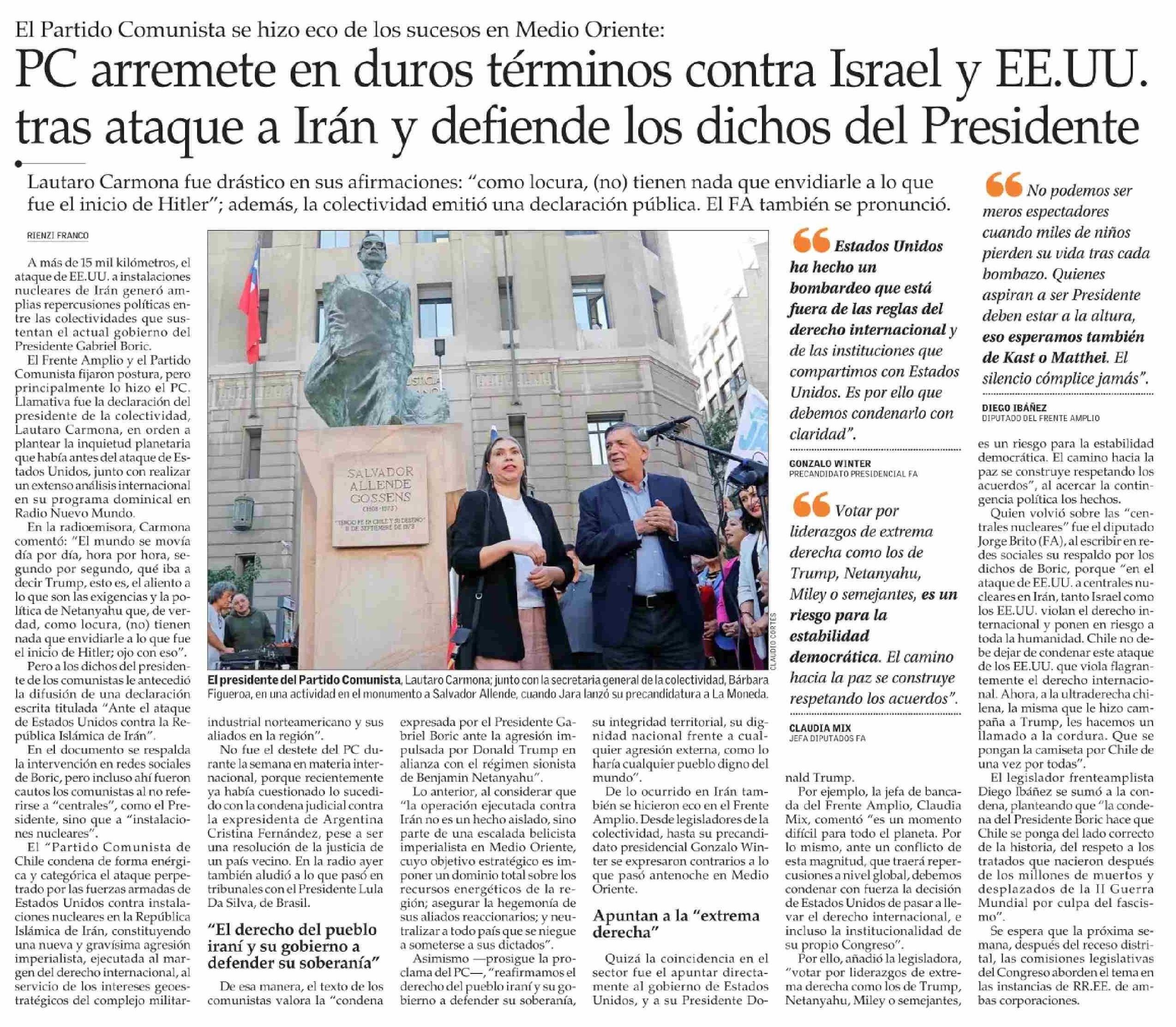 PC arremete en duros términos contra Israel y EE.UU. tras ataque a Irán y defiende los dichos del Presidente