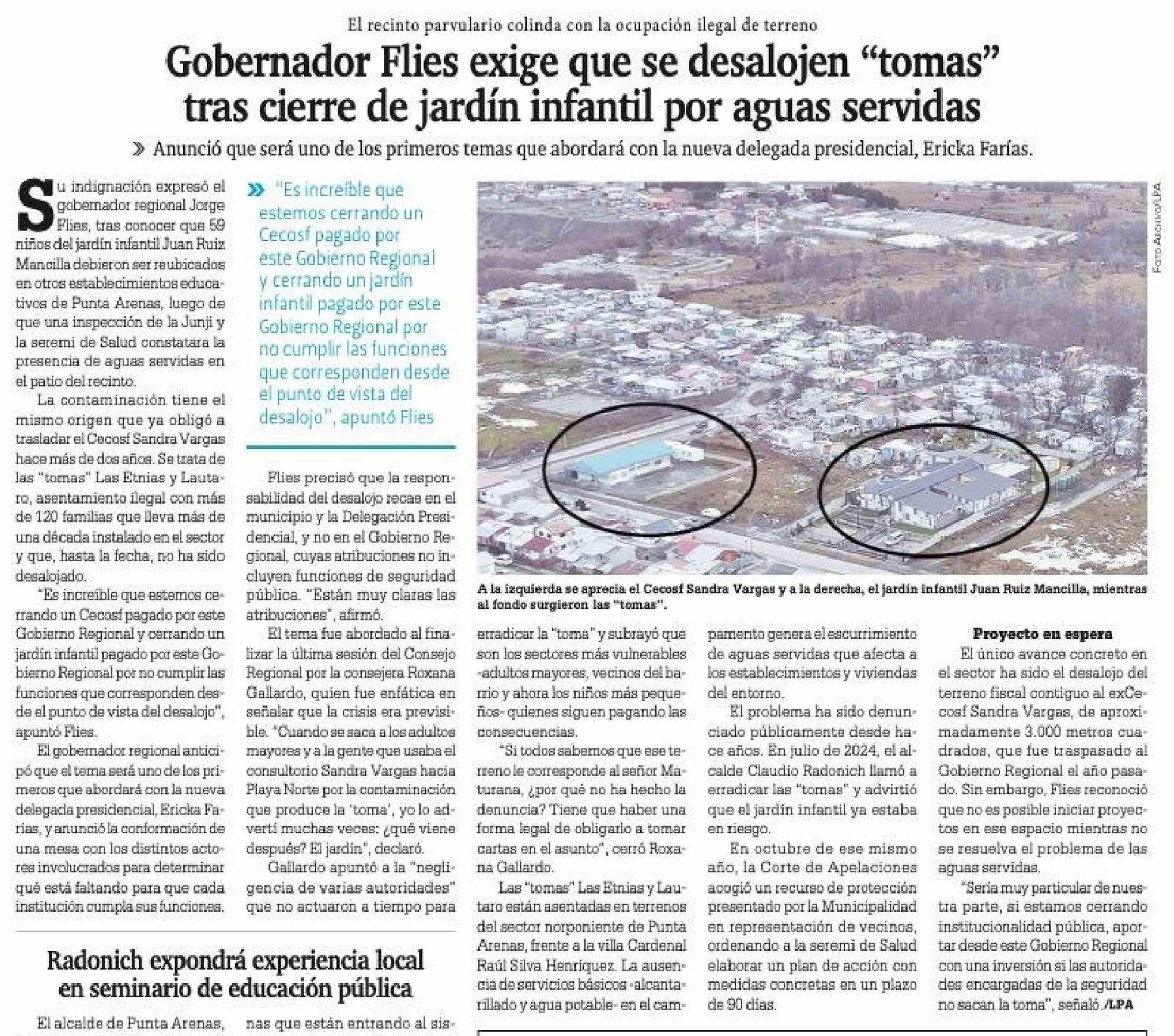 Gobernador Flies exige que se desalojen "tomas" tras cierre de jardín infantil por aguas servidas