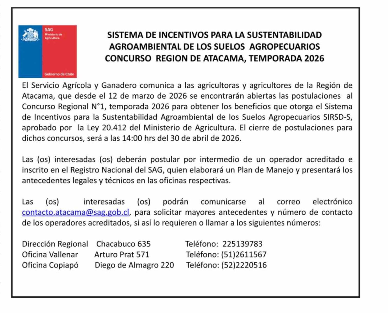| Título: | AVISO LICITACIONES: SISTEMA DE INCENTIVOS PARA LA SUSTENTABILIDAD AGROAMBIENTAL DE LOS SUELOS AGROPECUARIOS CONCURSO REGION DE ATACAMA, TEMPORADA 2026 |