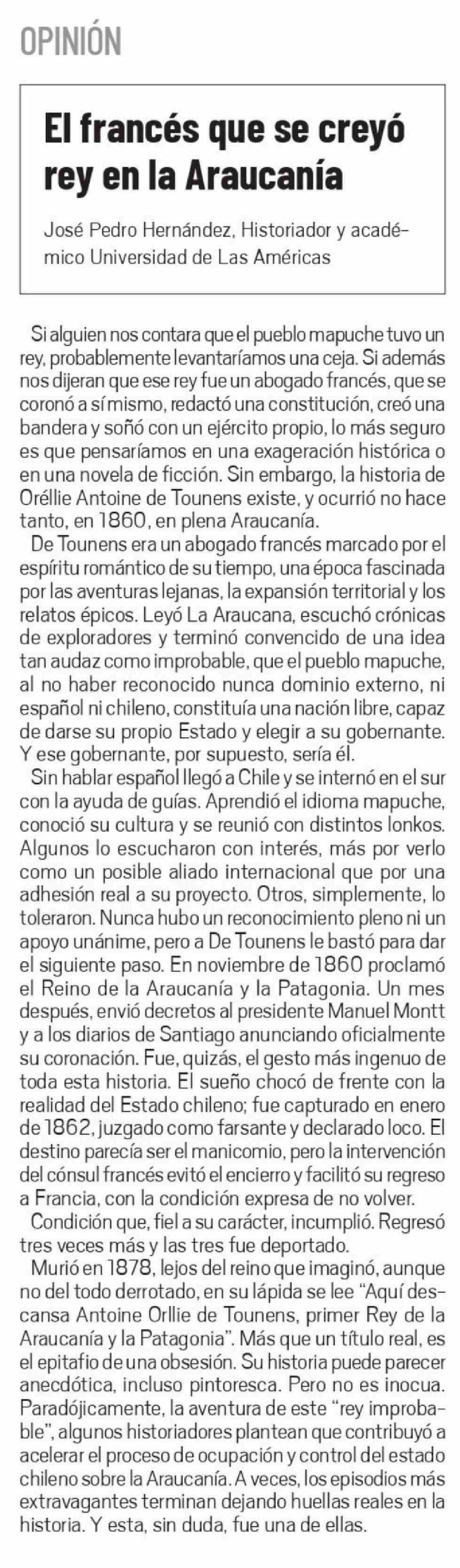Columnas de Opinión: El francés que se creyó rey en la Araucanía