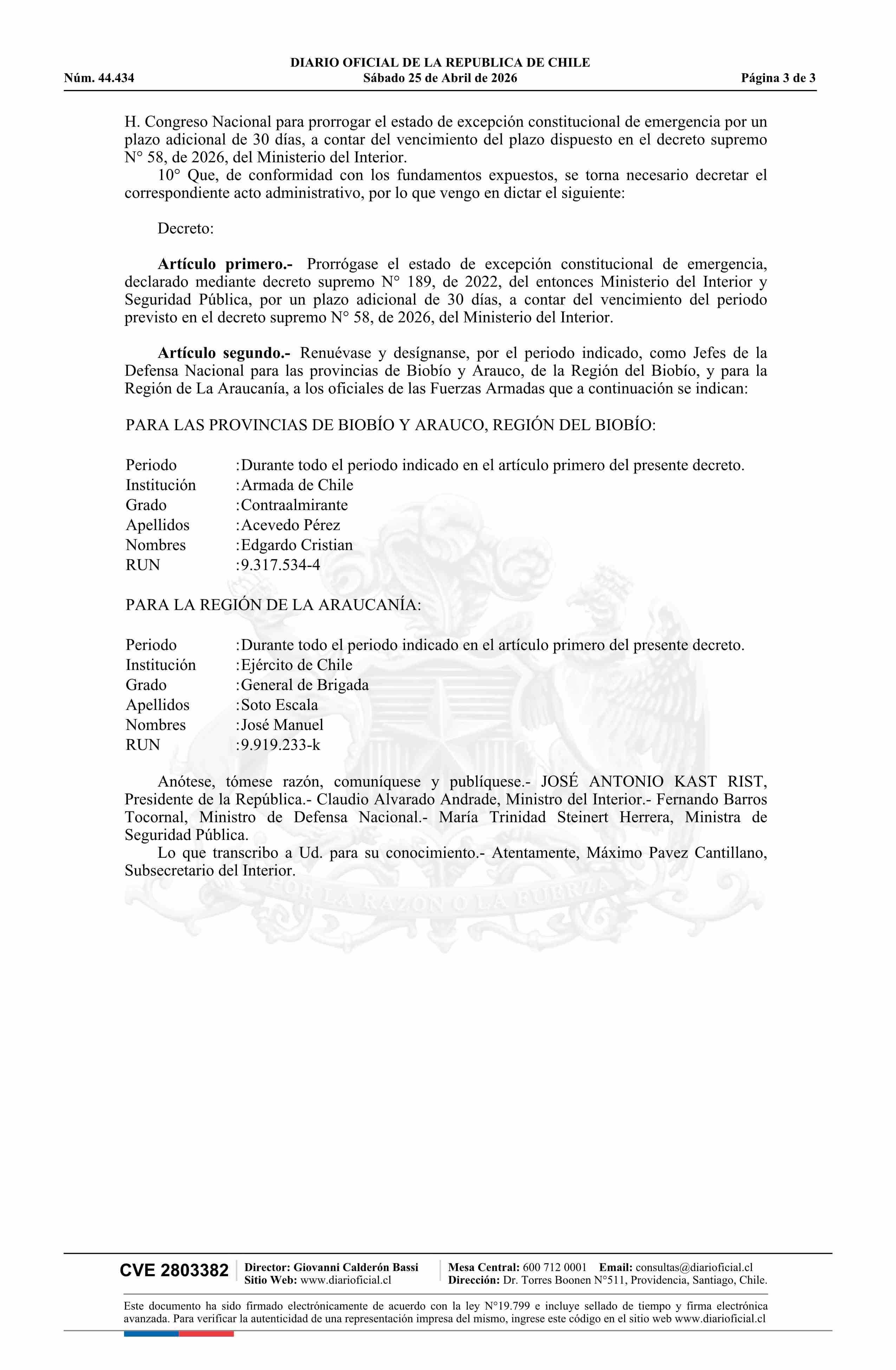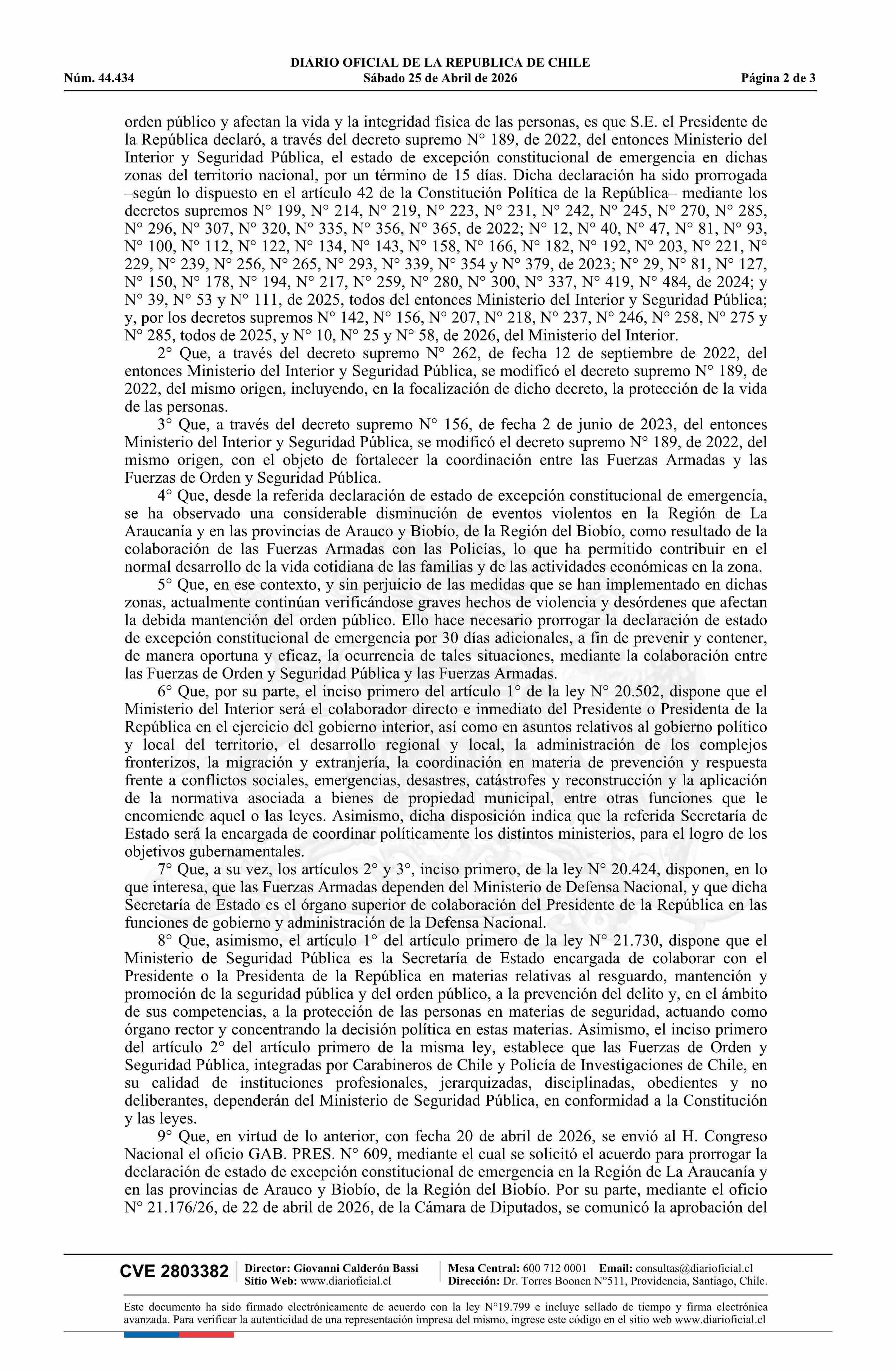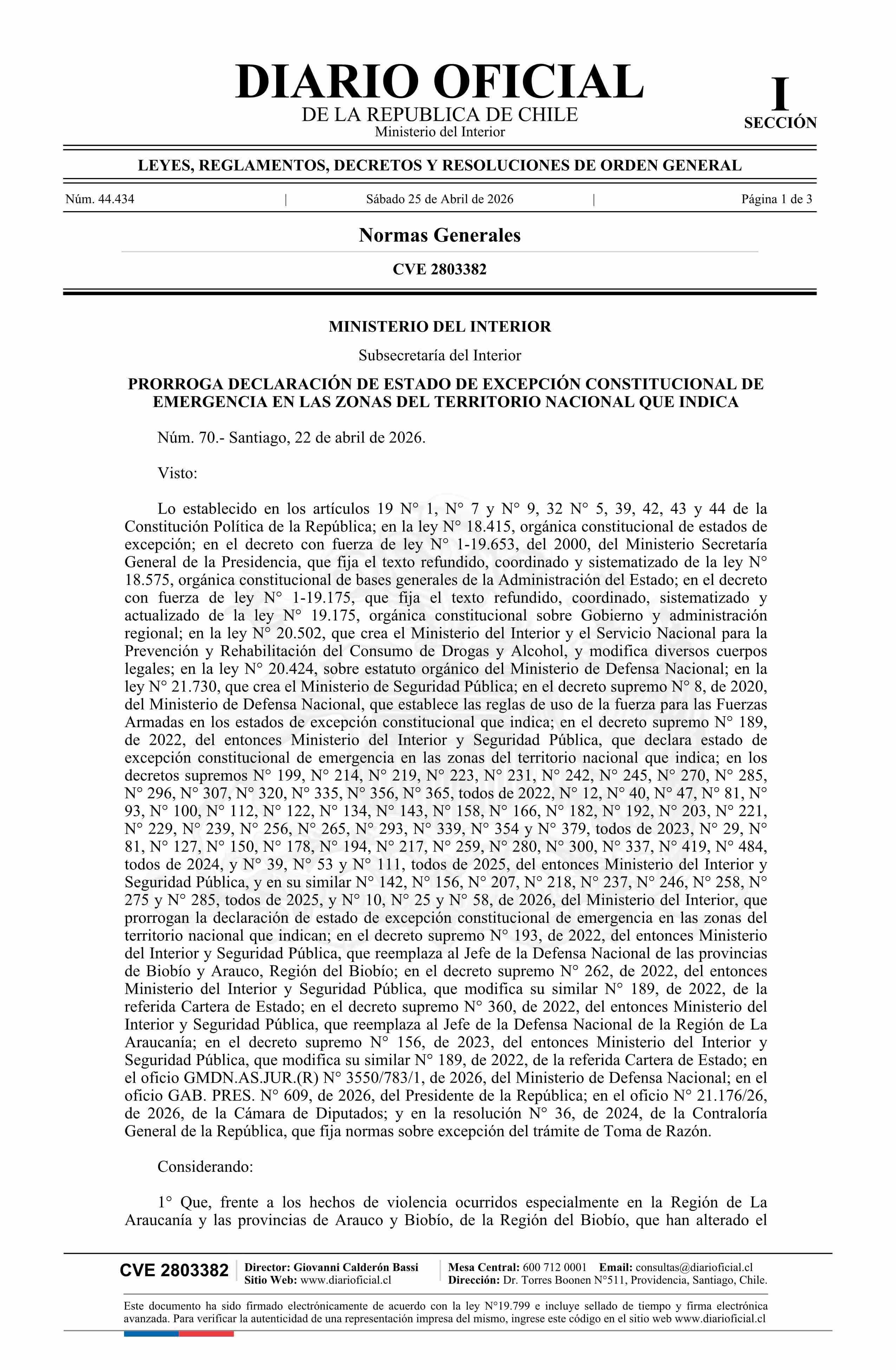 | Título: | Decreto número 70, de 2026.- Prorroga declaración de estado de excepción constitucional de emergencia en las zonas del territorio nacional que indica |