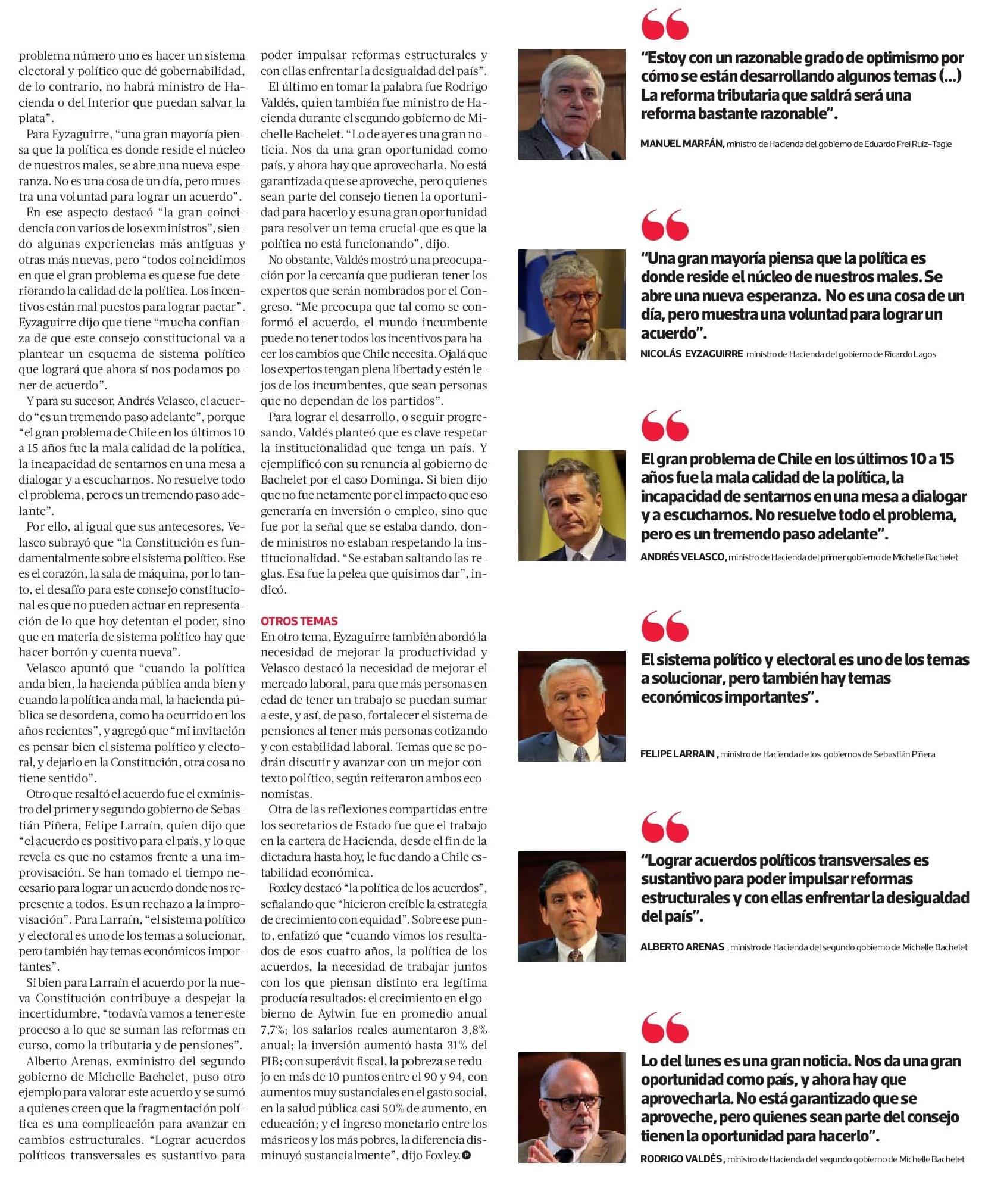 Exministros de Hacienda destacan acuerdo para una nueva Constitución y plantean que principal tarea es solucionar la fragmentación política