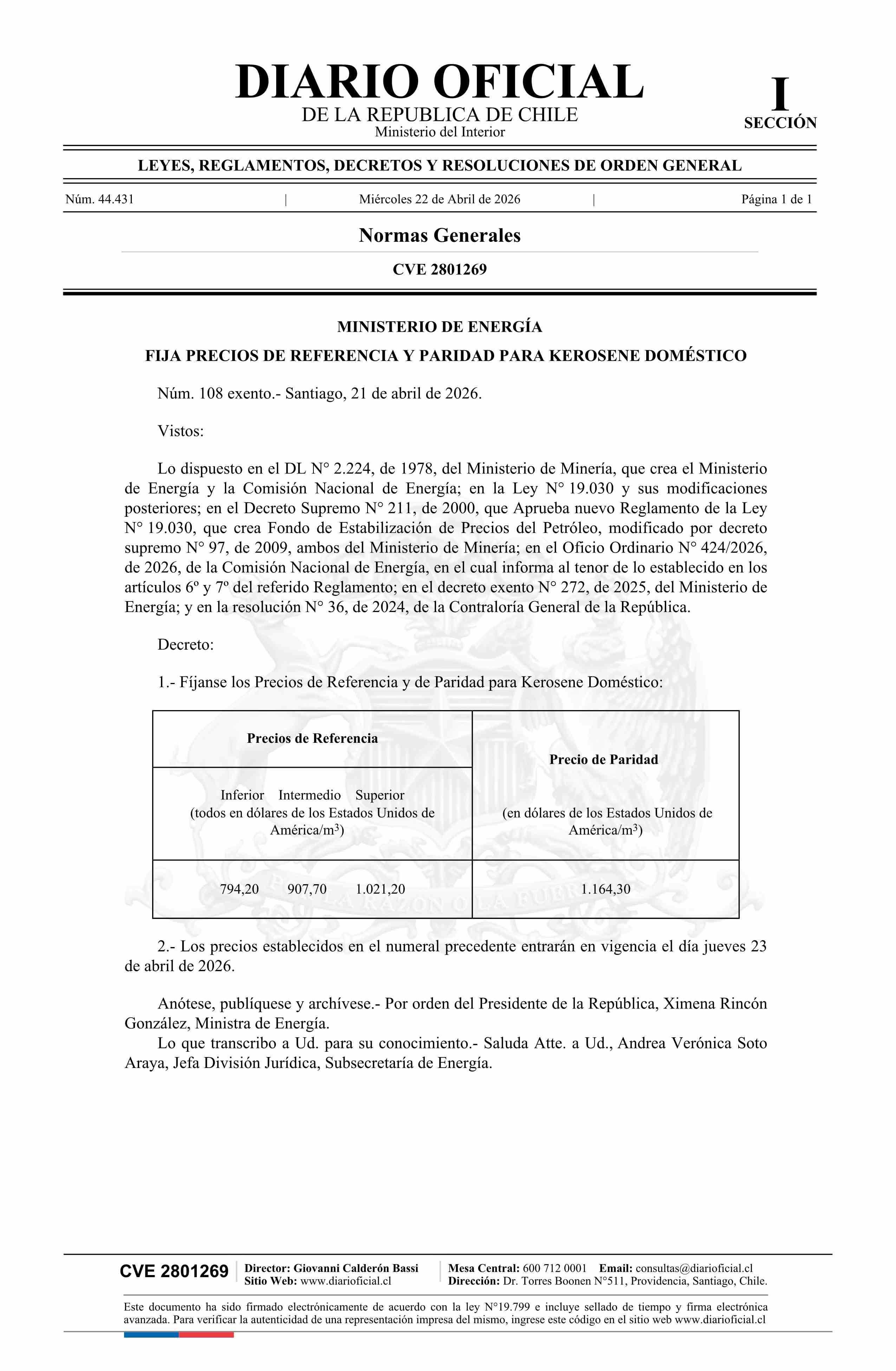 | Título: | Decreto exento número 108, de 2026.- Fija precios de referencia y paridad para kerosene doméstico |