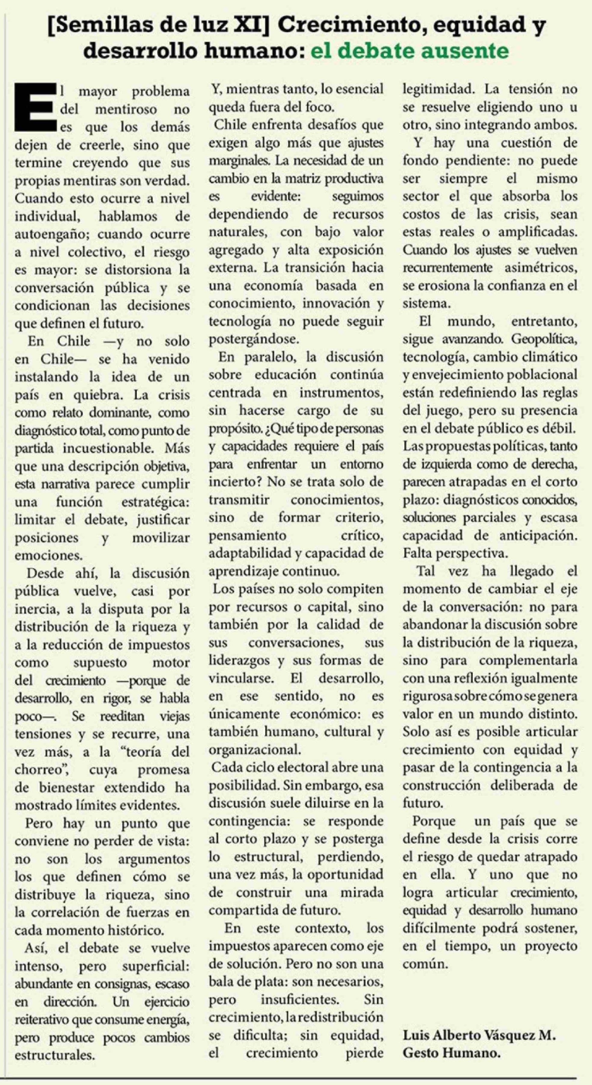 Columnas de Opinión: [Semillas de luz XI] Crecimiento, equidad y desarrollo humano: el debate ausente