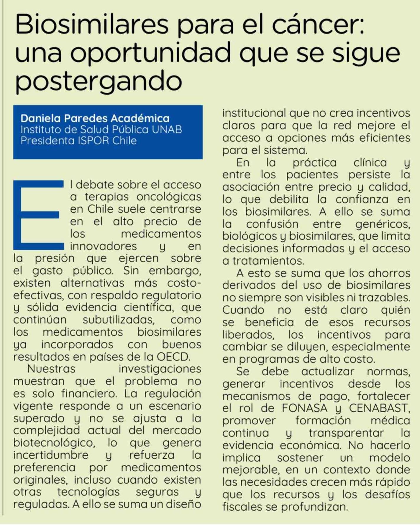 Columnas de Opinión: Biosimilares para el cáncer: una oportunidad que se sigue postergando