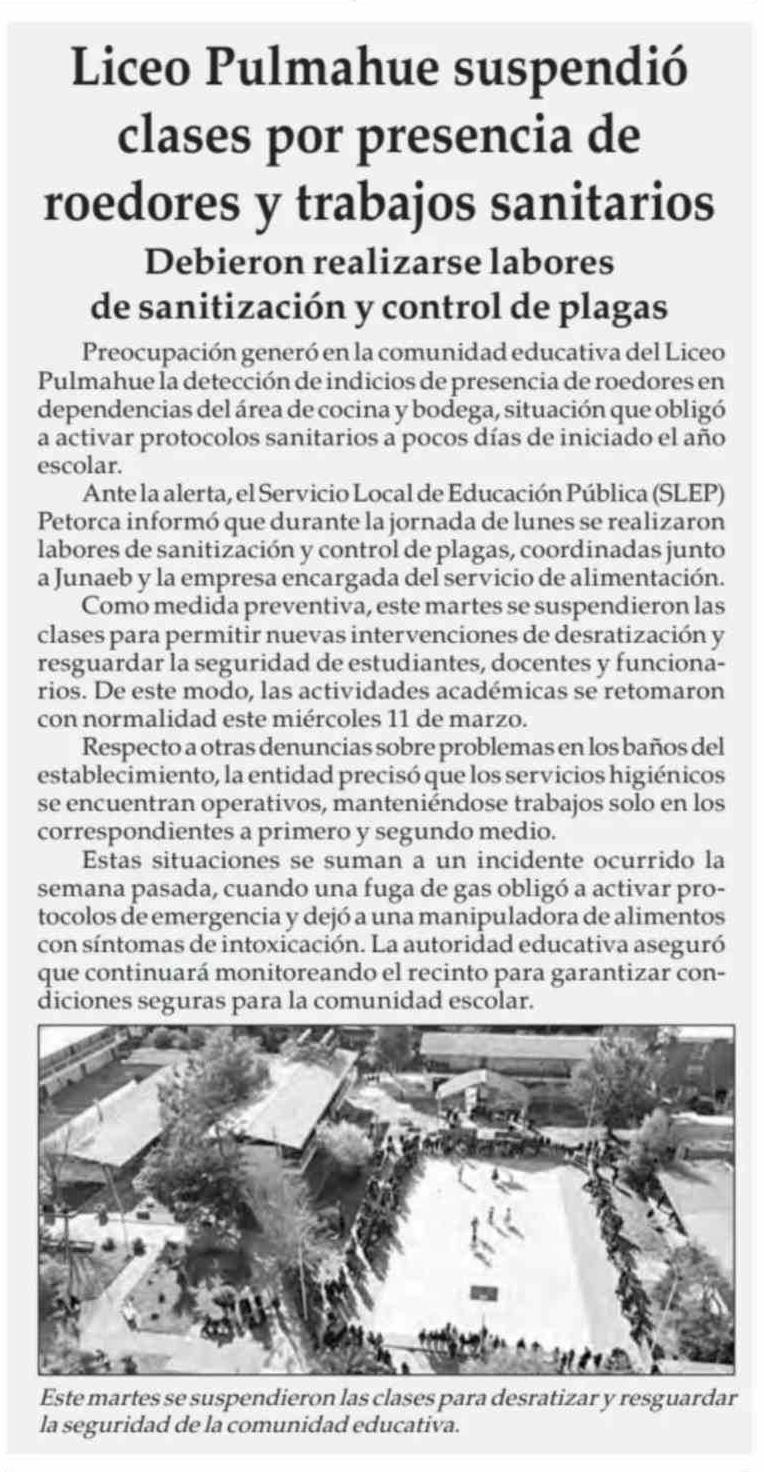 Liceo Pulmahue suspendió clases por presencia de roedores y trabajos sanitarios