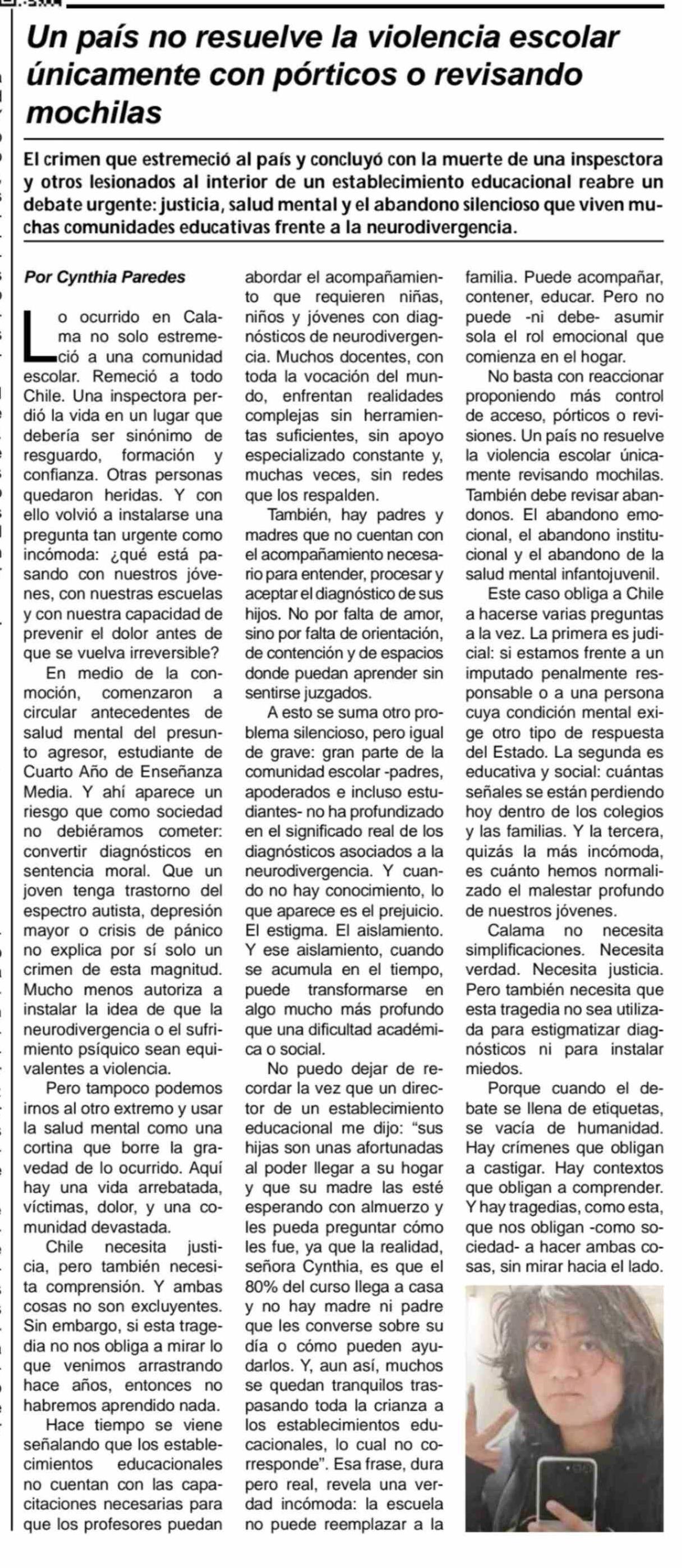 Título: Columnas de Opinión: Un país no resuelve la violencia escolar únicamente con pórticos o revisando mochilas