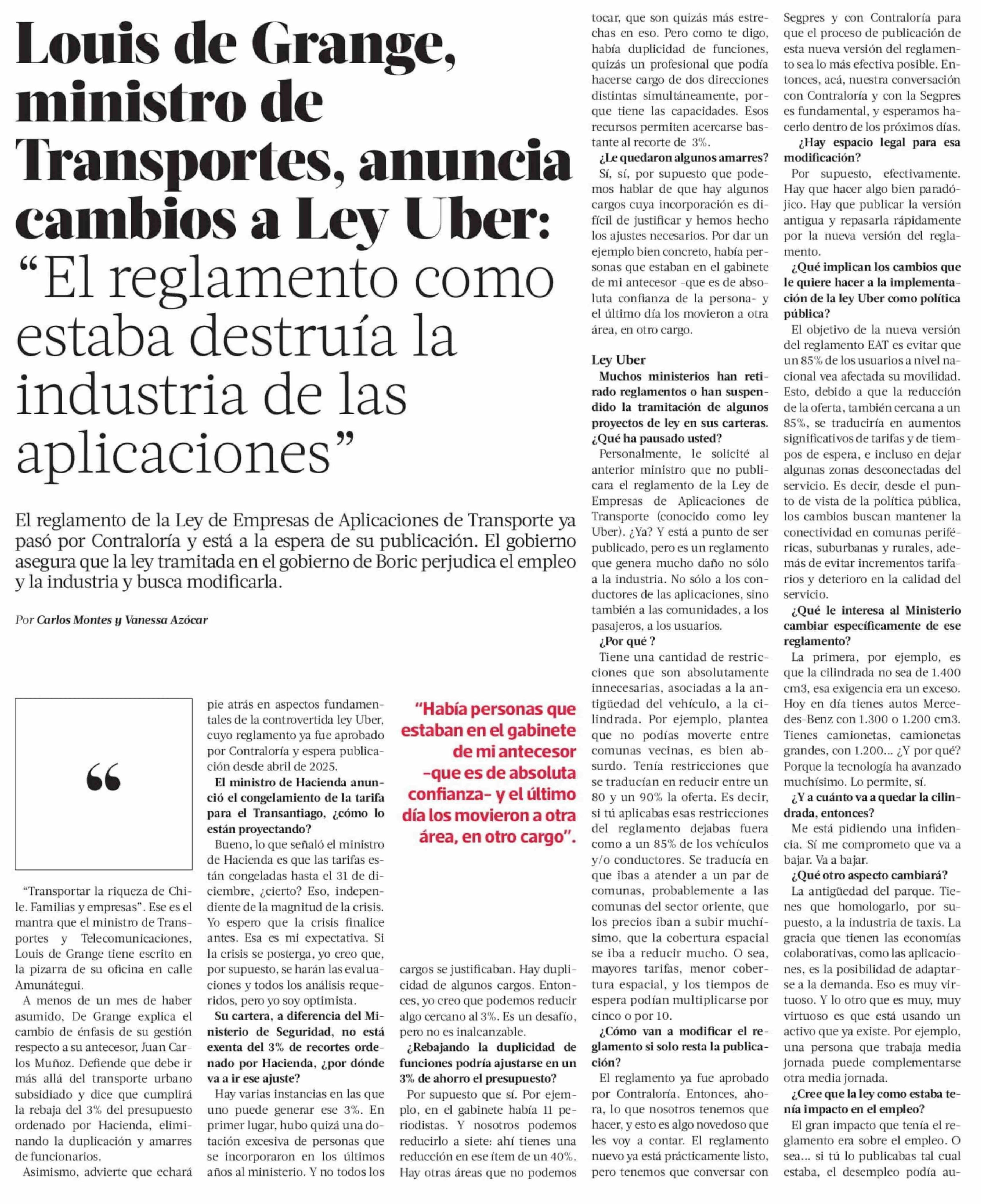 Louis de Grange, ministro de Transportes, anuncia cambios a Ley Uber: "El reglamento como estaba destruía la industria de las aplicaciones"