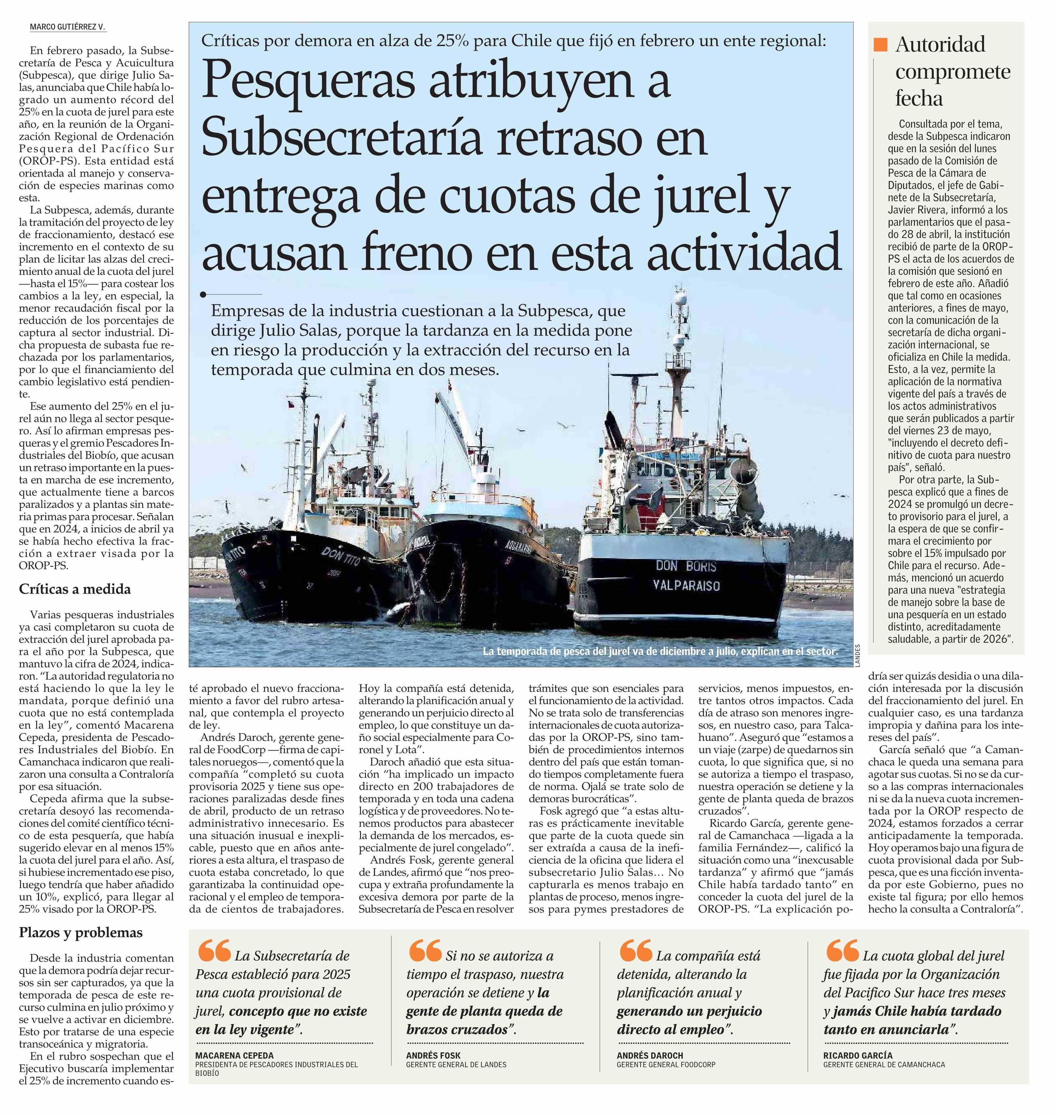 Pesqueras atribuyen a Subsecretaría retraso en entrega de cuotas de jurel y acusan freno en esta actividad