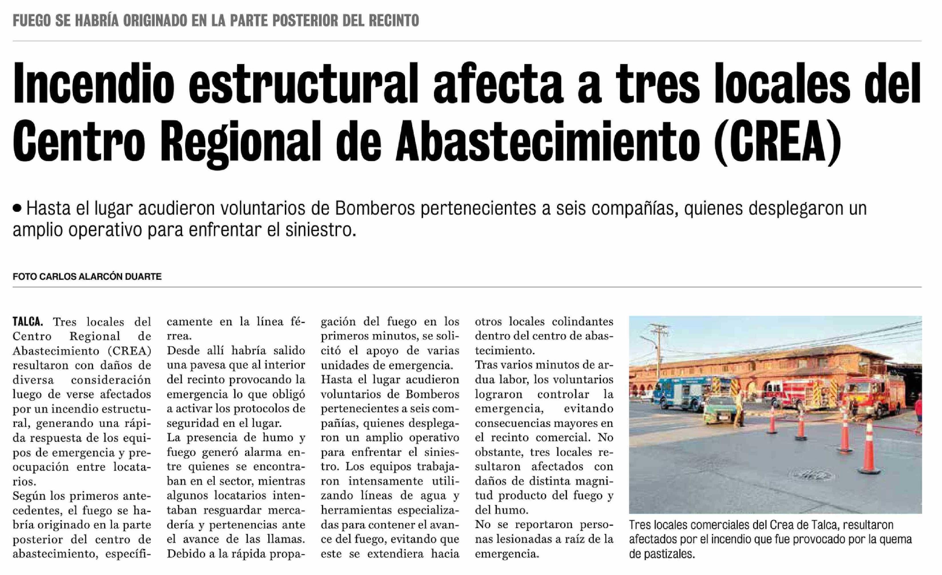 Incendio estructural afecta a tres locales del Centro Regional de Abastecimiento (CREA)