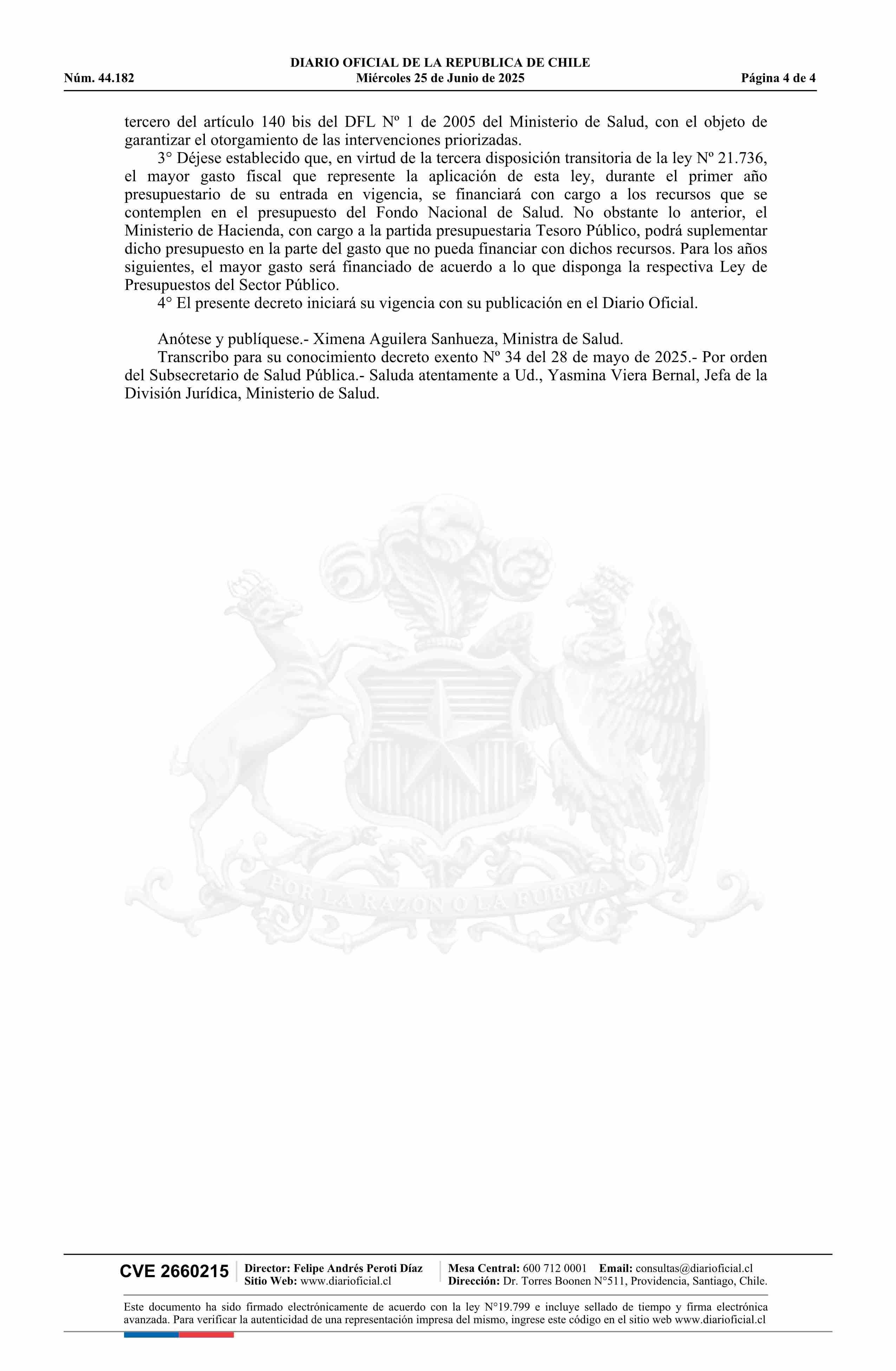| Título: | Decreto exento número 34, de 2025.- Determina nómina de intervenciones sanitarias priorizadas otorgadas por sistema de acceso priorizado para el año 2025, conforme a la ley Nº 21.736 |