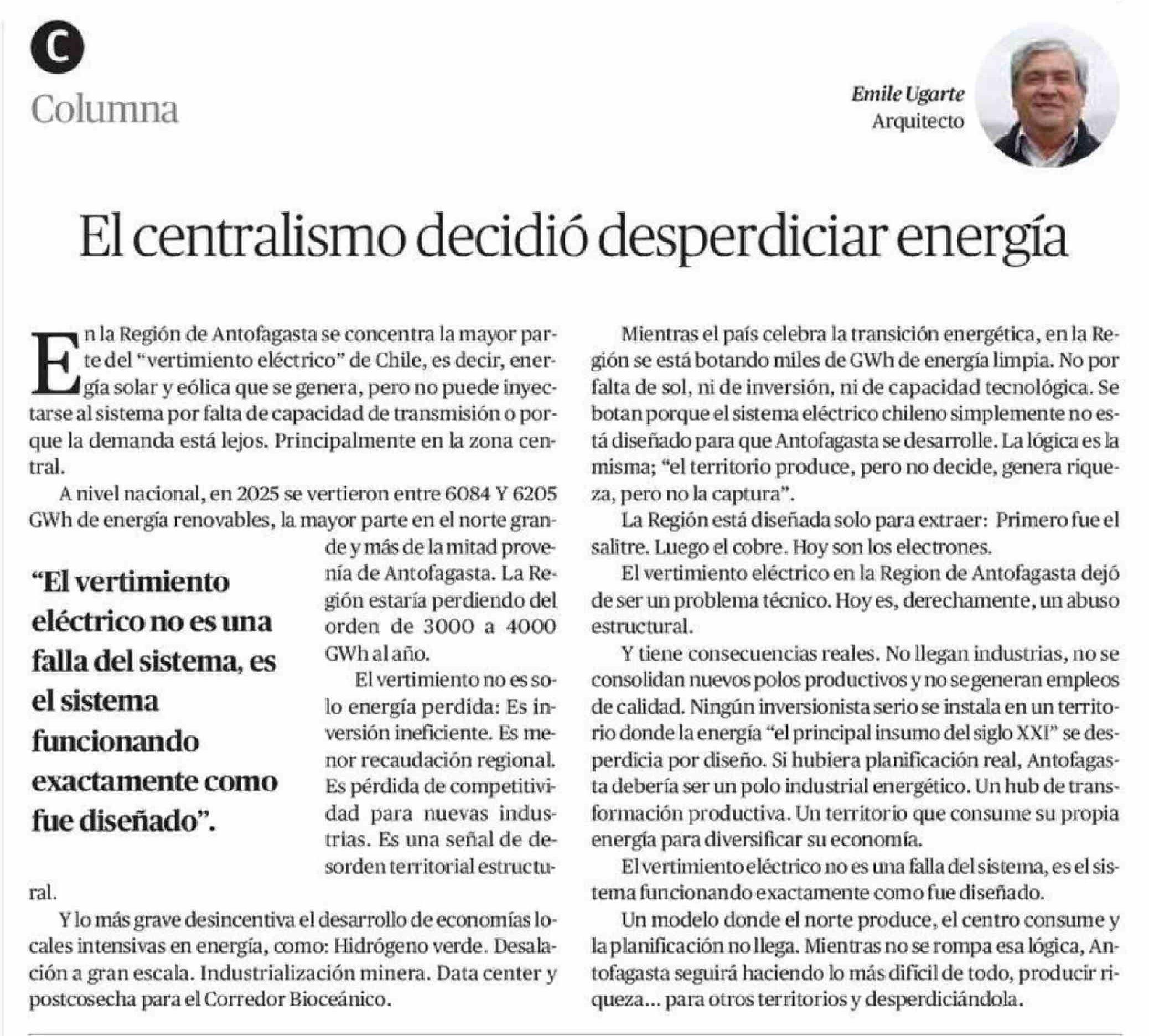 Columnas de Opinión: El centralismo decidió desperdiciar energía