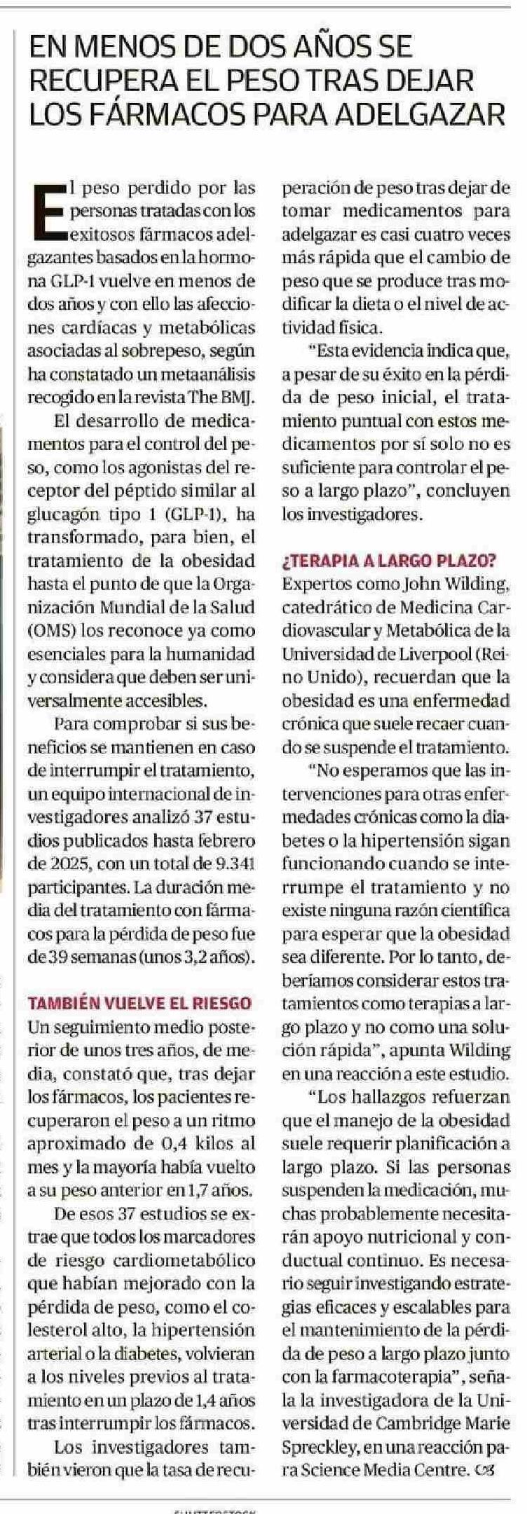 EN MENOS DE DOS AÑOS SE RECUPERA EL PESO TRAS DEJAR LOS FÁRMACOS PARA ADELGAZAR