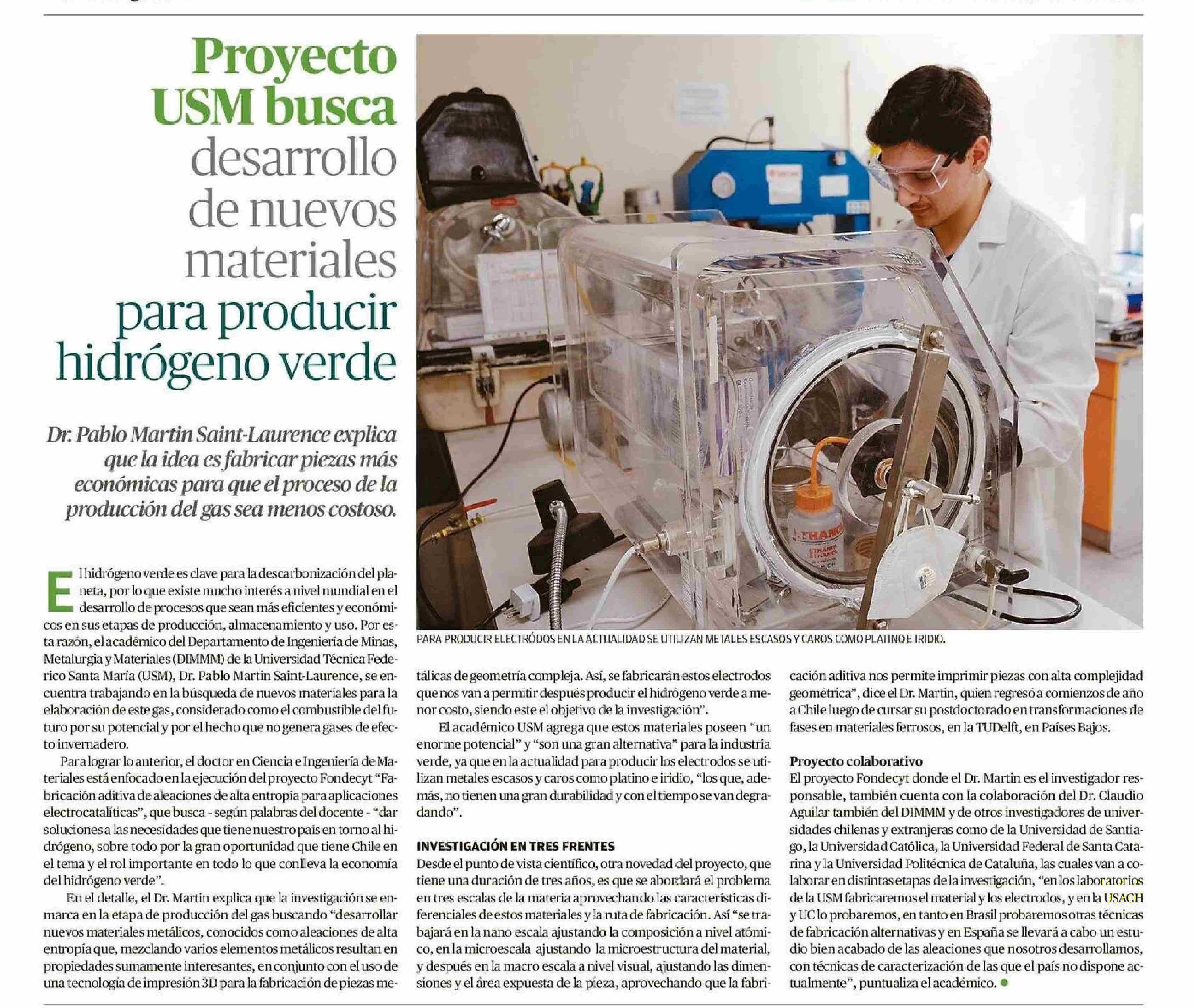 Proyecto USM busca desarrollo de nuevos materiales para producir hidrógeno verde