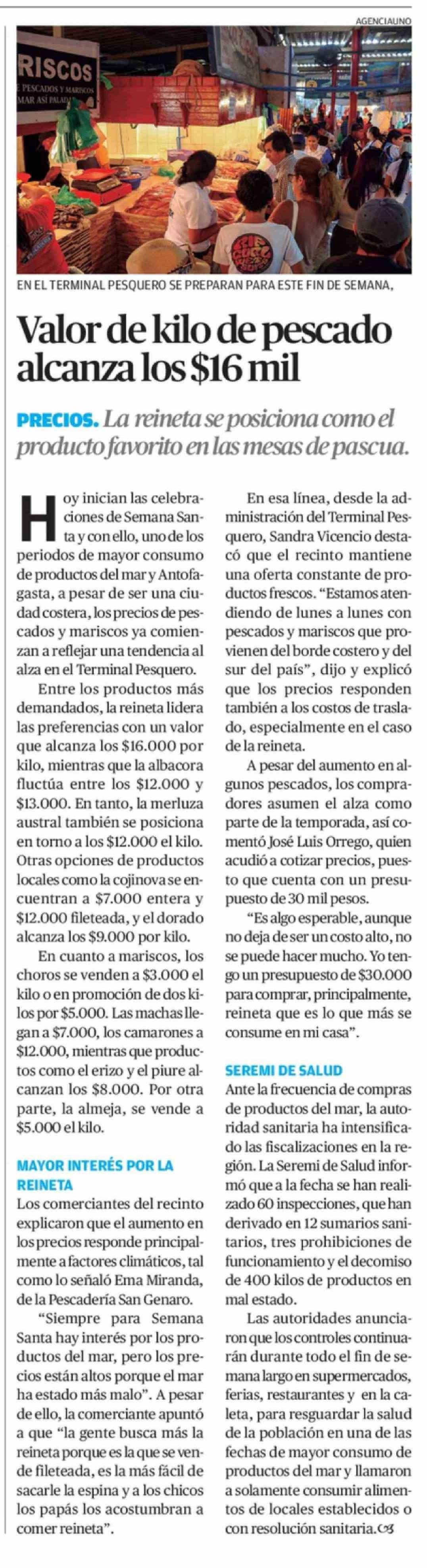 Título: Valor de kilo de pescado alcanza los $16 mil