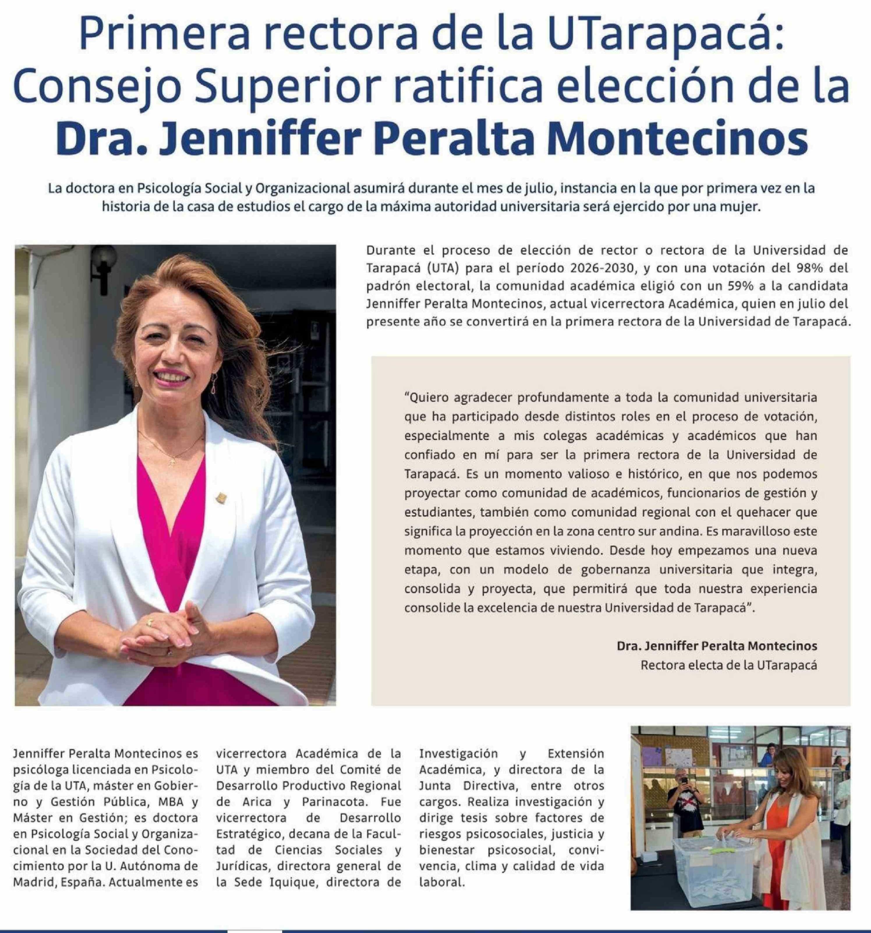 Primera rectora de la UTarapacá: Consejo Superior ratifica elección de la Dra. Jenniffer Peralta Montecinos