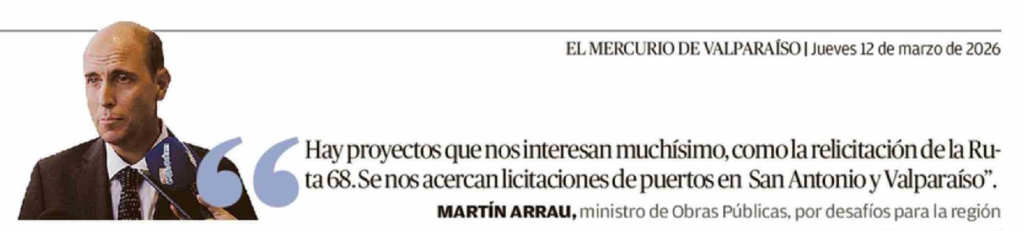 | Título: | Hay proyectos que nos interesan muchísimo, como la relicitación de la Ru66 ta 68.Se nos acercan licitaciones de puertos en San Antonio y Valparaíso". MARTÍN ARRAU, ministro de Obras Públicas, por desafíos para la región |