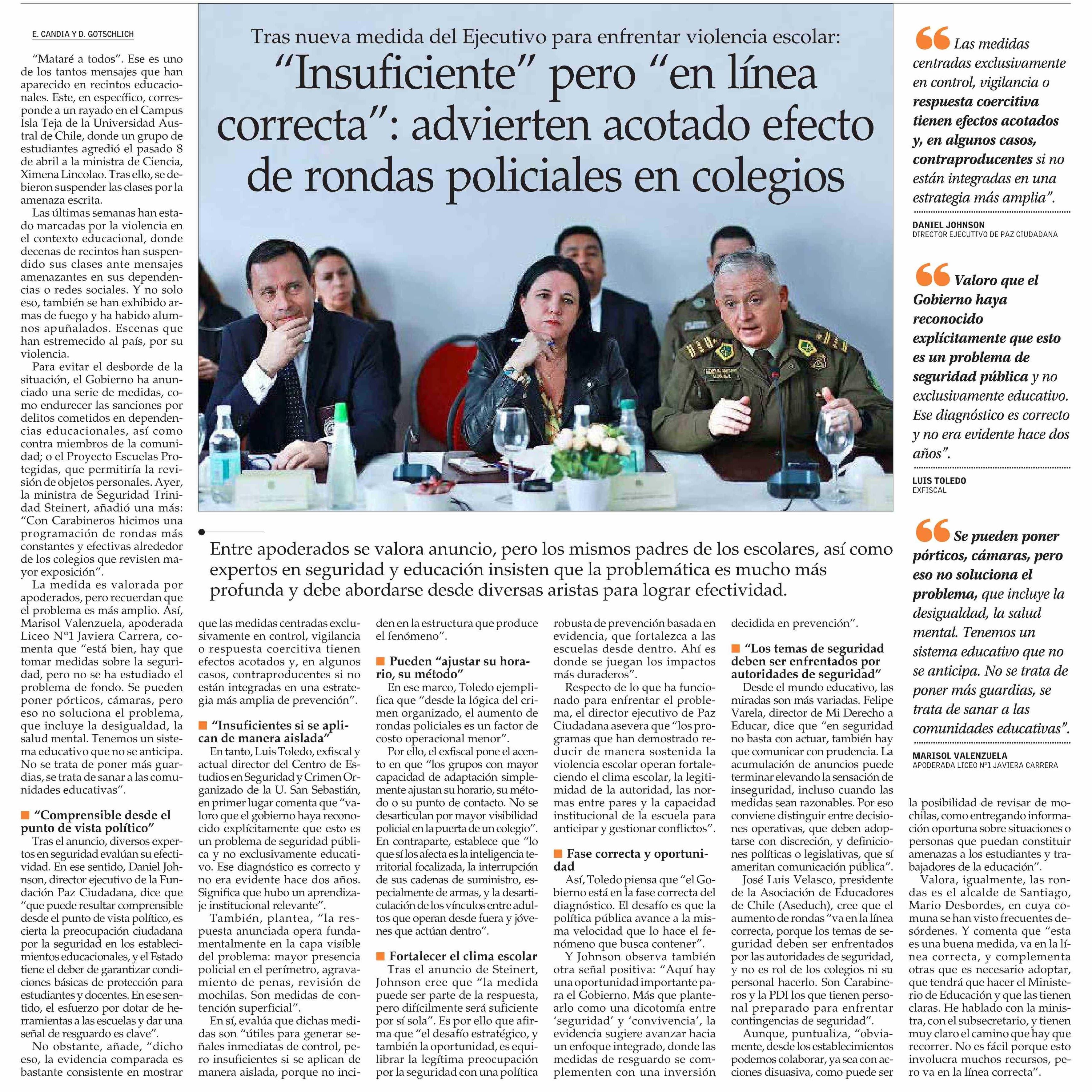 Título: “Insuficiente” pero “en línea correcta”: advierten acotado efecto de rondas policiales en colegios