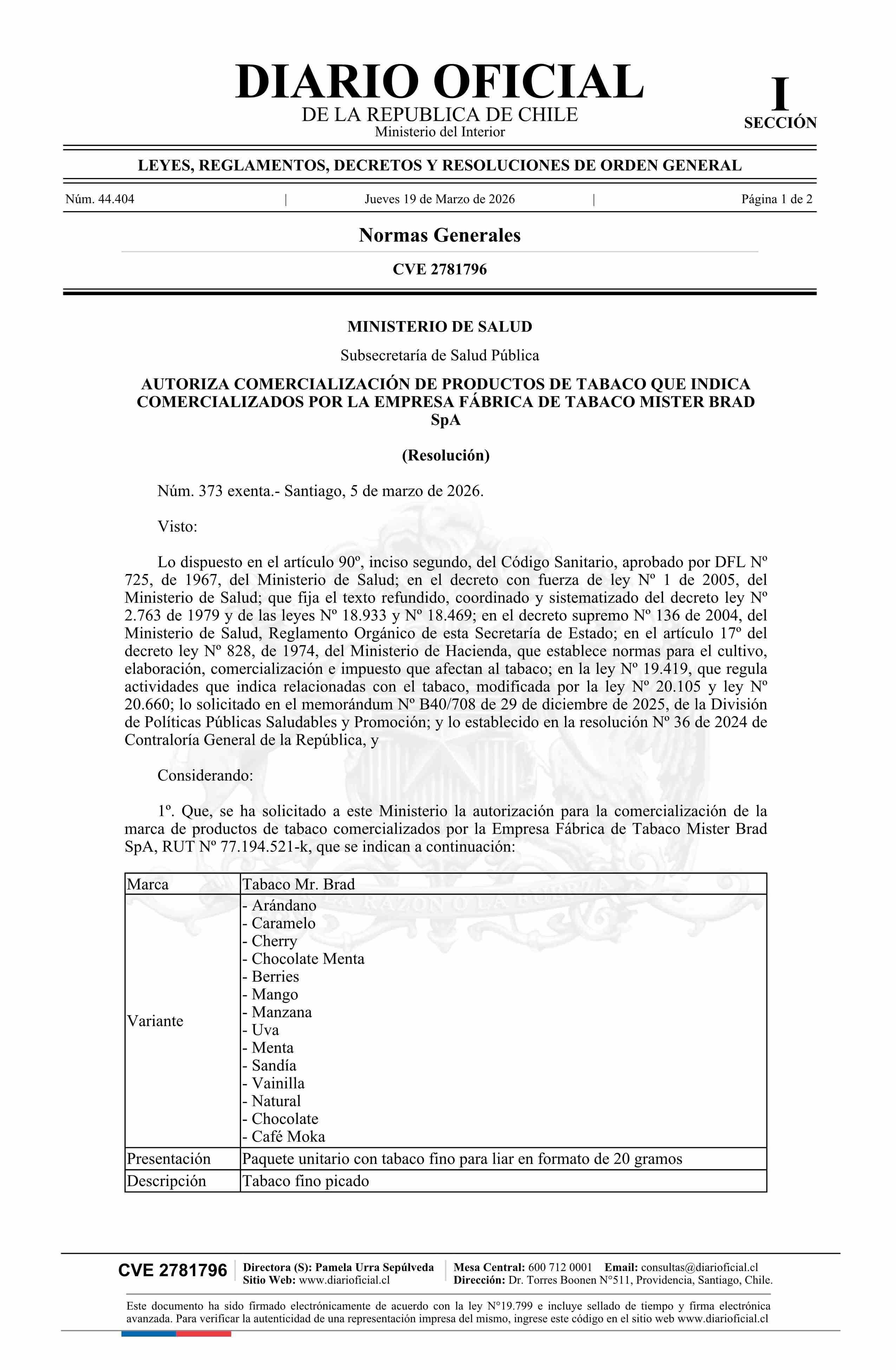 | Título: | Resolución exenta número 373, de 2026.- Autoriza comercialización de productos de tabaco que indica comercializados por la empresa Fábrica de Tabaco Mister Brad SpA |