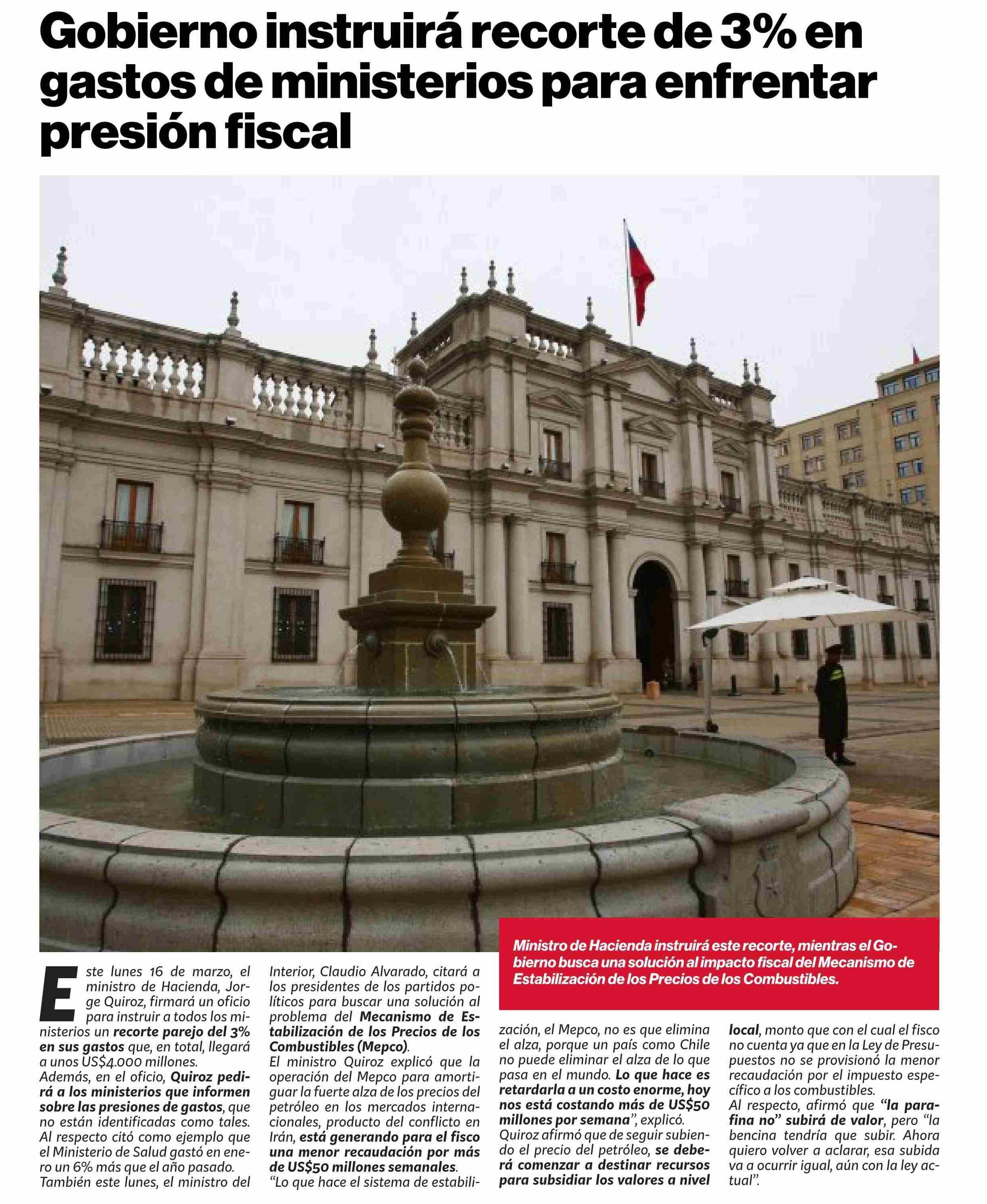 Gobierno instruirá recorte de 3% en gastos de ministerios para enfrentar presión fiscal