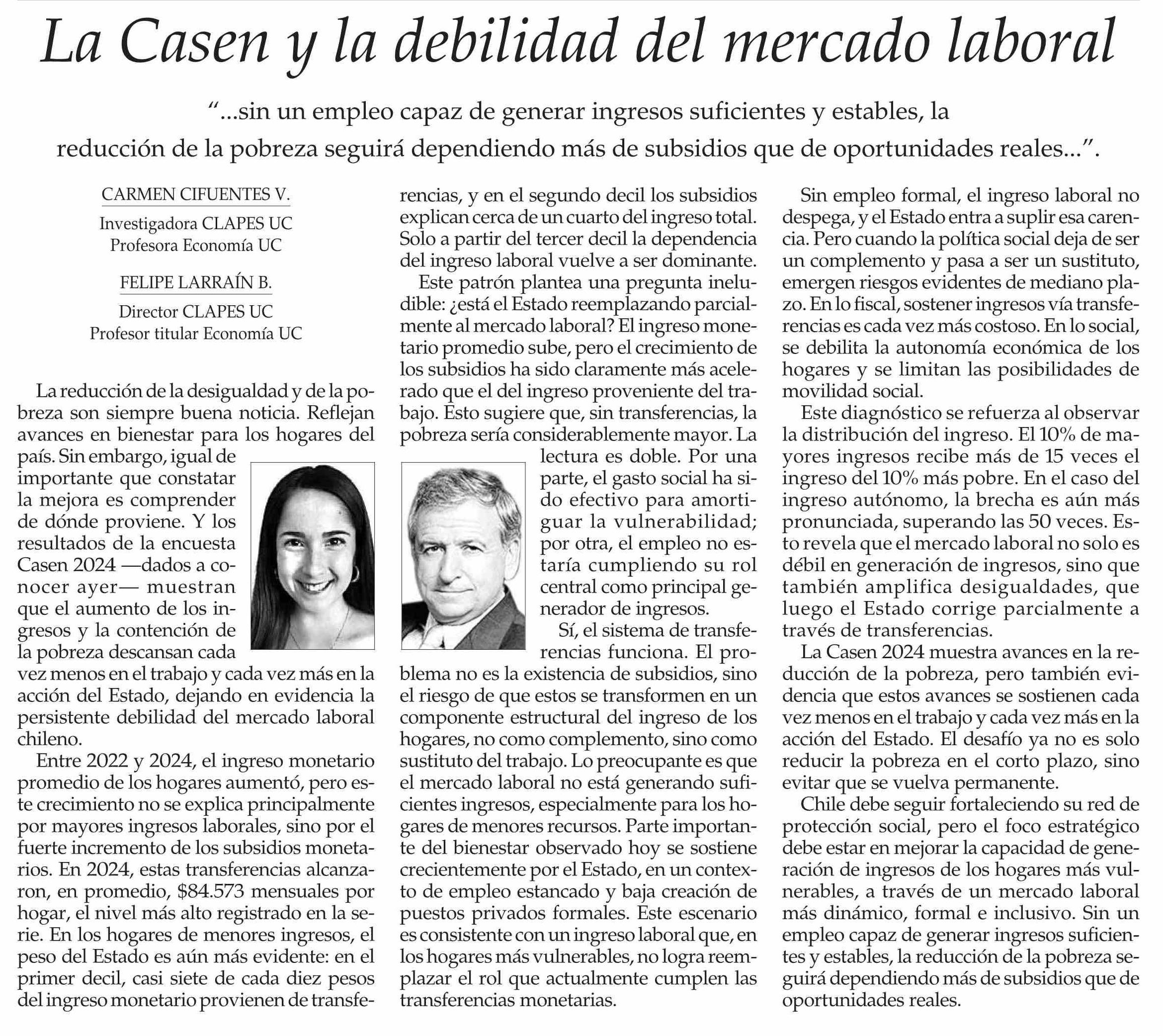 Columnas de Opinión: La Casen y la debilidad del mercado laboral
