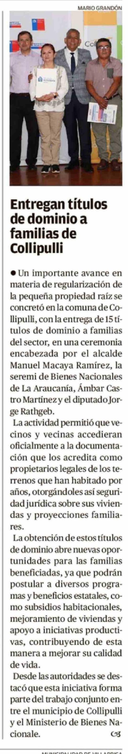 Entregan títulos de dominio a familias de Collipulli