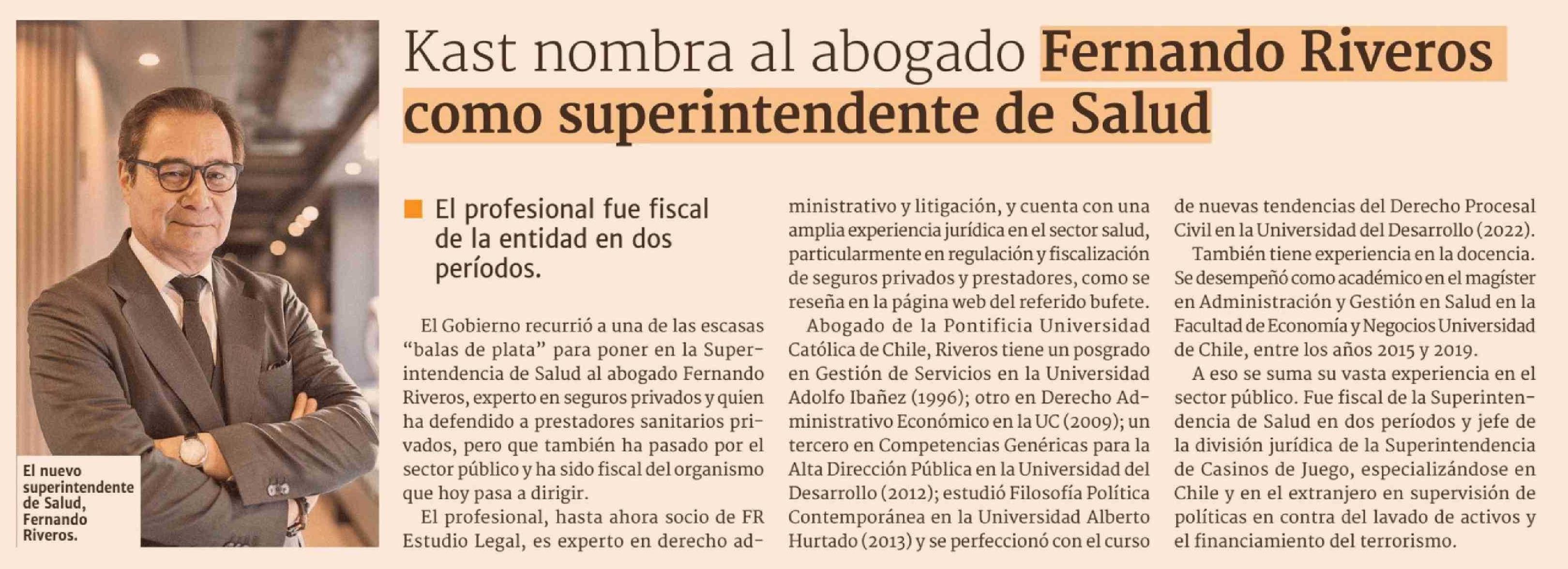 Título: Kast nombra al abogado Fernando Riveros como superintendente de Salud