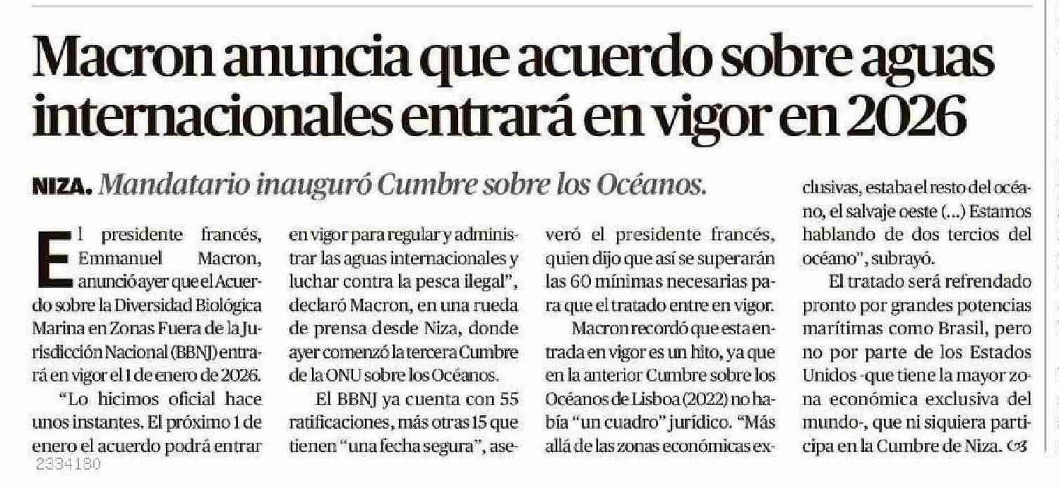 Macron anuncia que acuerdo sobre aguas internacionales entrará en vigor en 2026