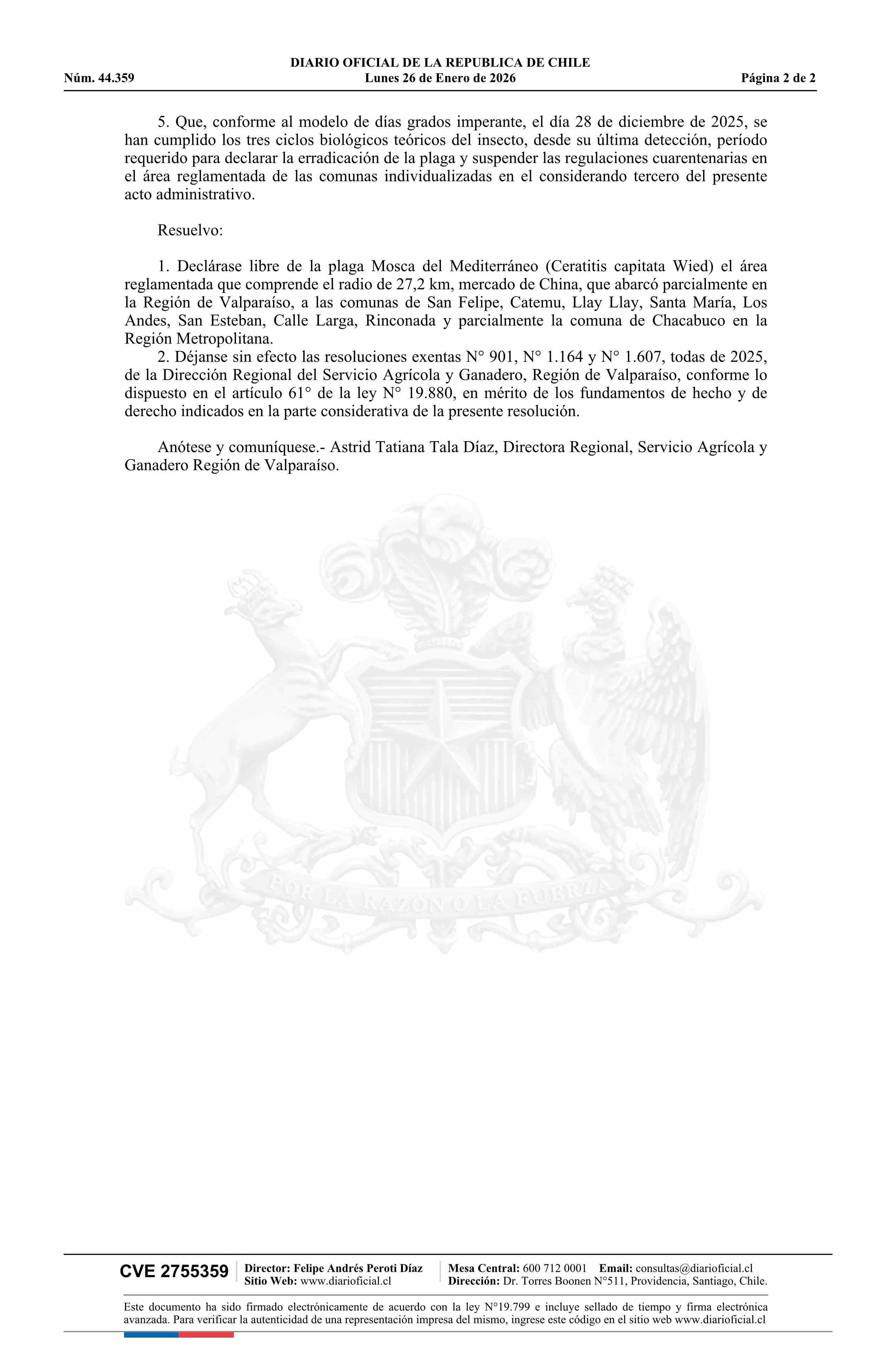 Título: Resolución exenta número 3.468, de 2025.- Declara libre de Mosca del Mediterráneo (Ceratitis capitata W.) el área regulada que indica. Brote San Felipe 27,2 Km mercado China, y deja sin efecto resoluciones exentas N° 901, N° 1.164 y N° 1.607, todas de 2025