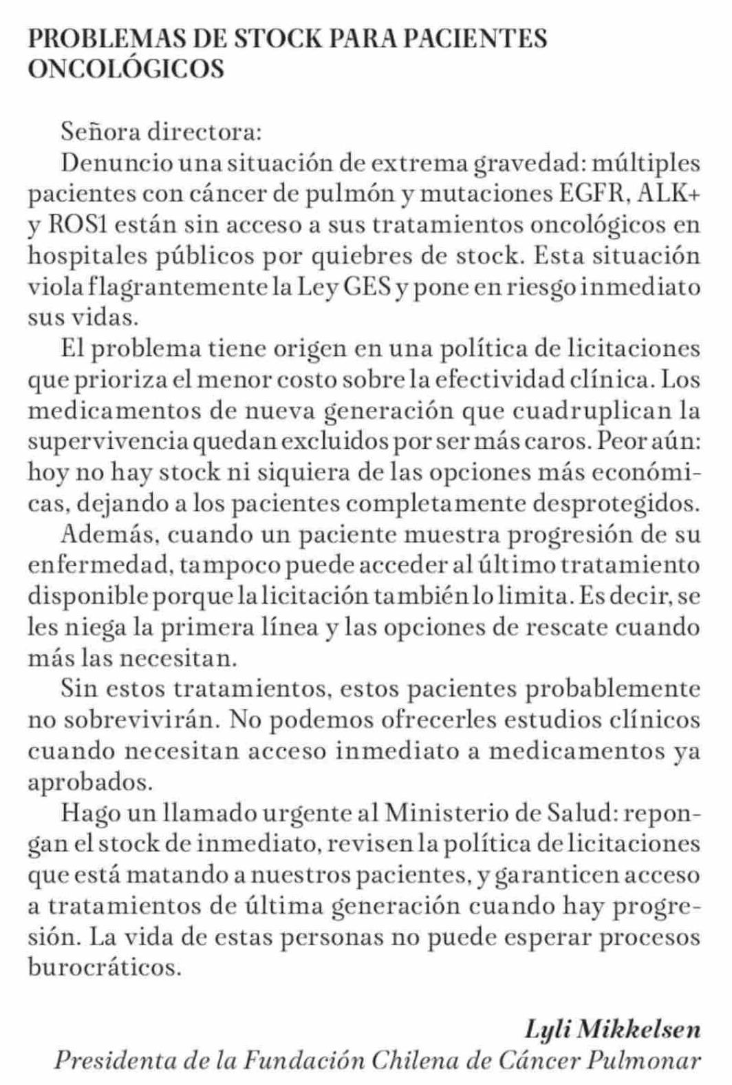 CARTAS: PROBLEMAS DE STOCK PARA PACIENTES ONCOLÓGICOS