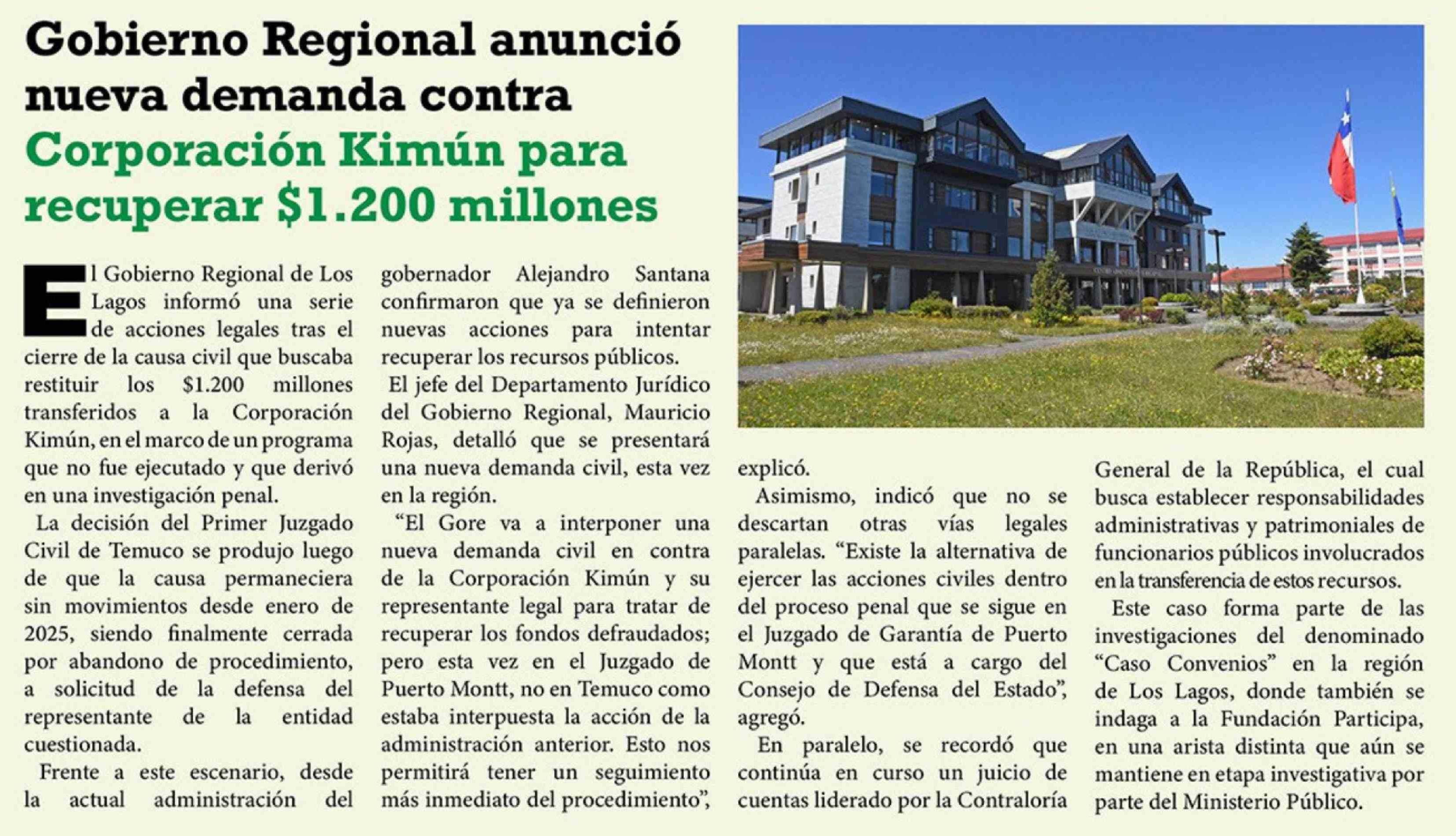 Gobierno Regional anunció nueva demanda contra Corporación Kimún para recuperar $1.200 millones