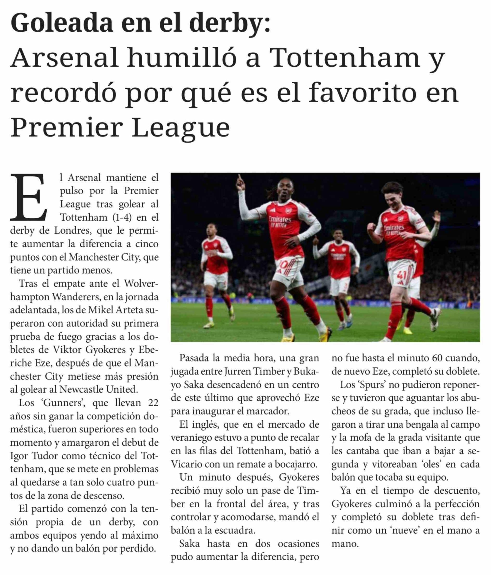 Goleada en el derby: Arsenal humilló a Tottenham y recordó por qué es el favorito en Premier League