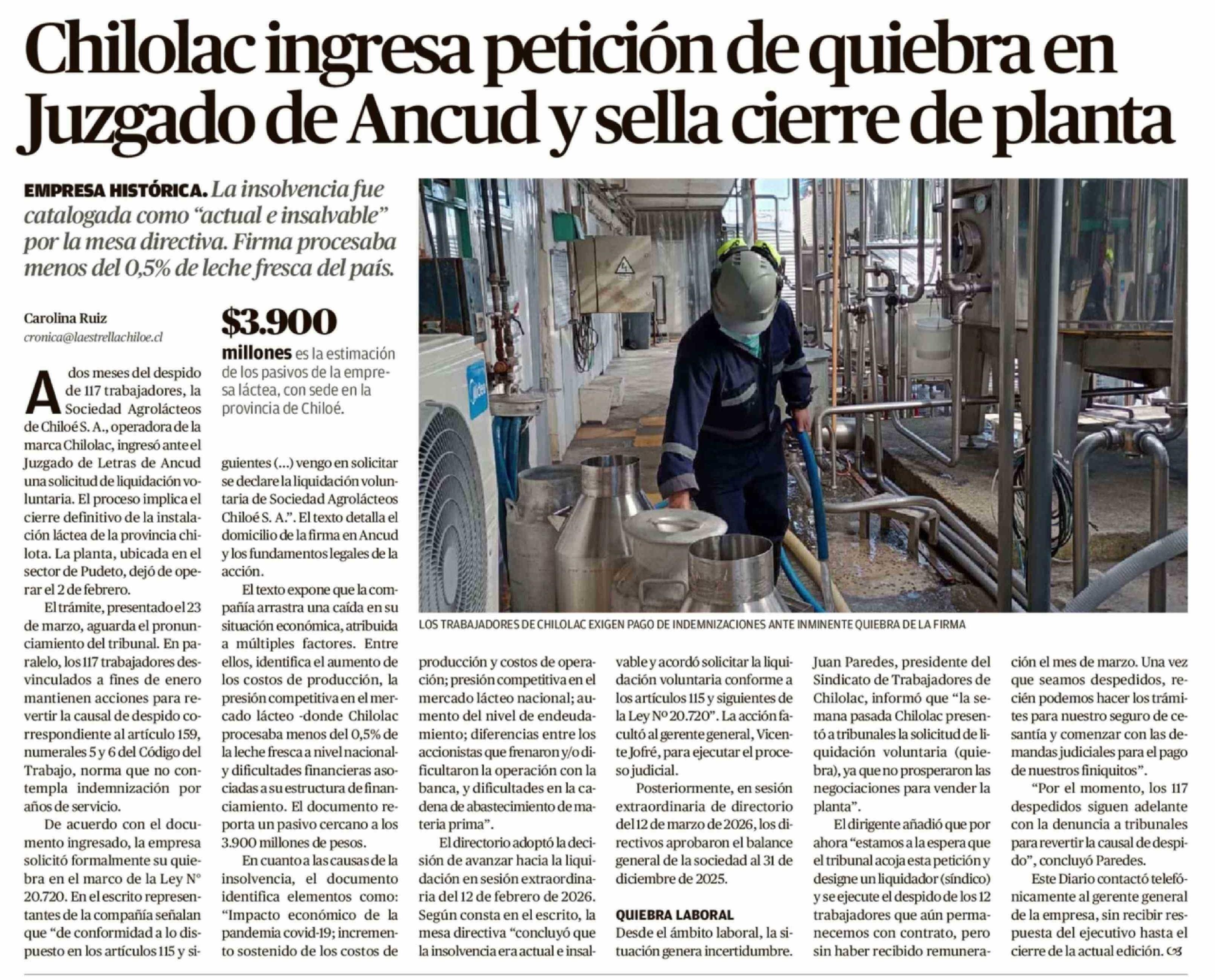 Chilolac ingresa petición de quiebra en Juzgado de Ancud y sella cierre de planta