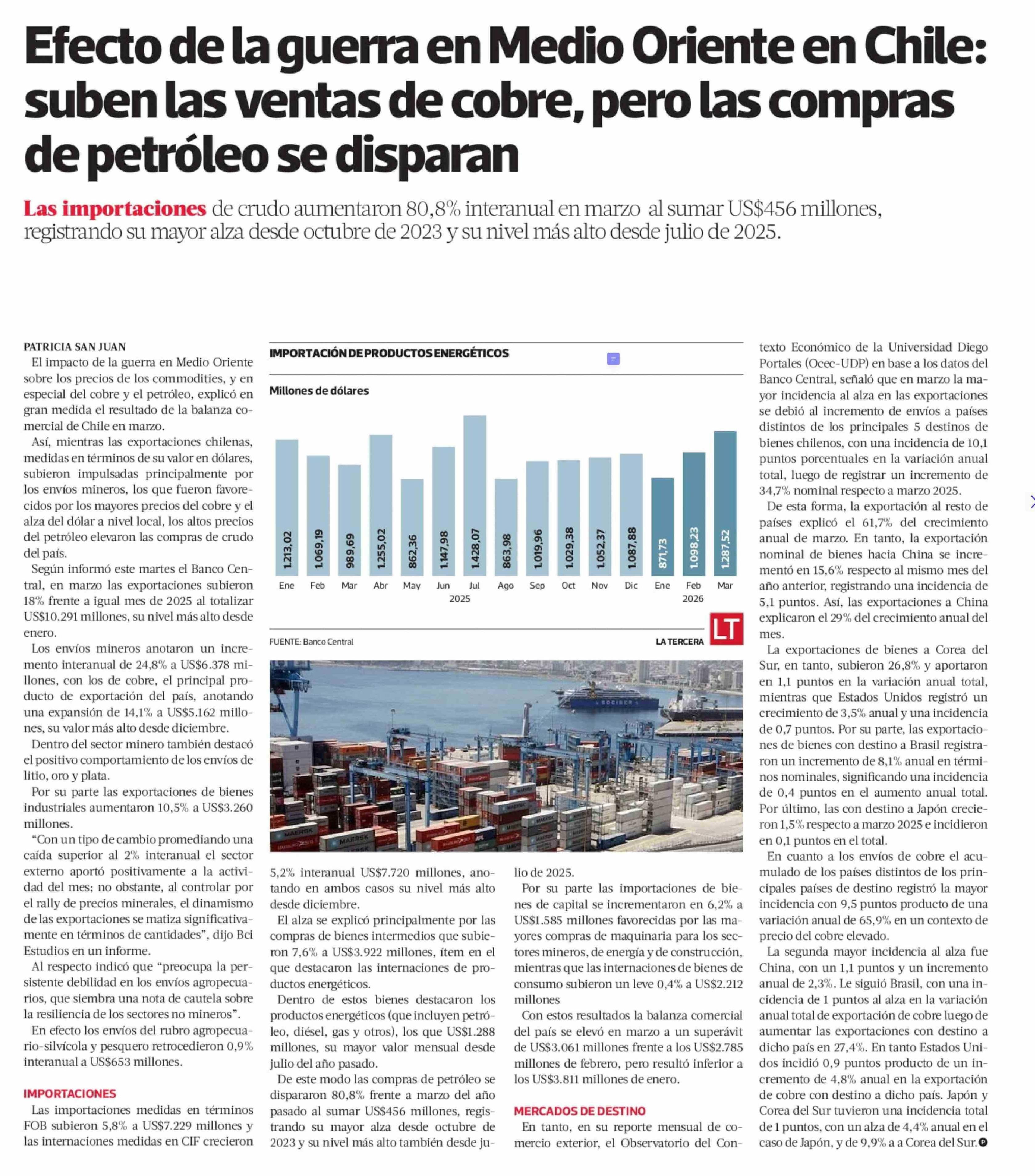 Título: Efecto de la guerra en Medio Oriente en Chile: suben las ventas de cobre, pero las compras de petróleo se disparan