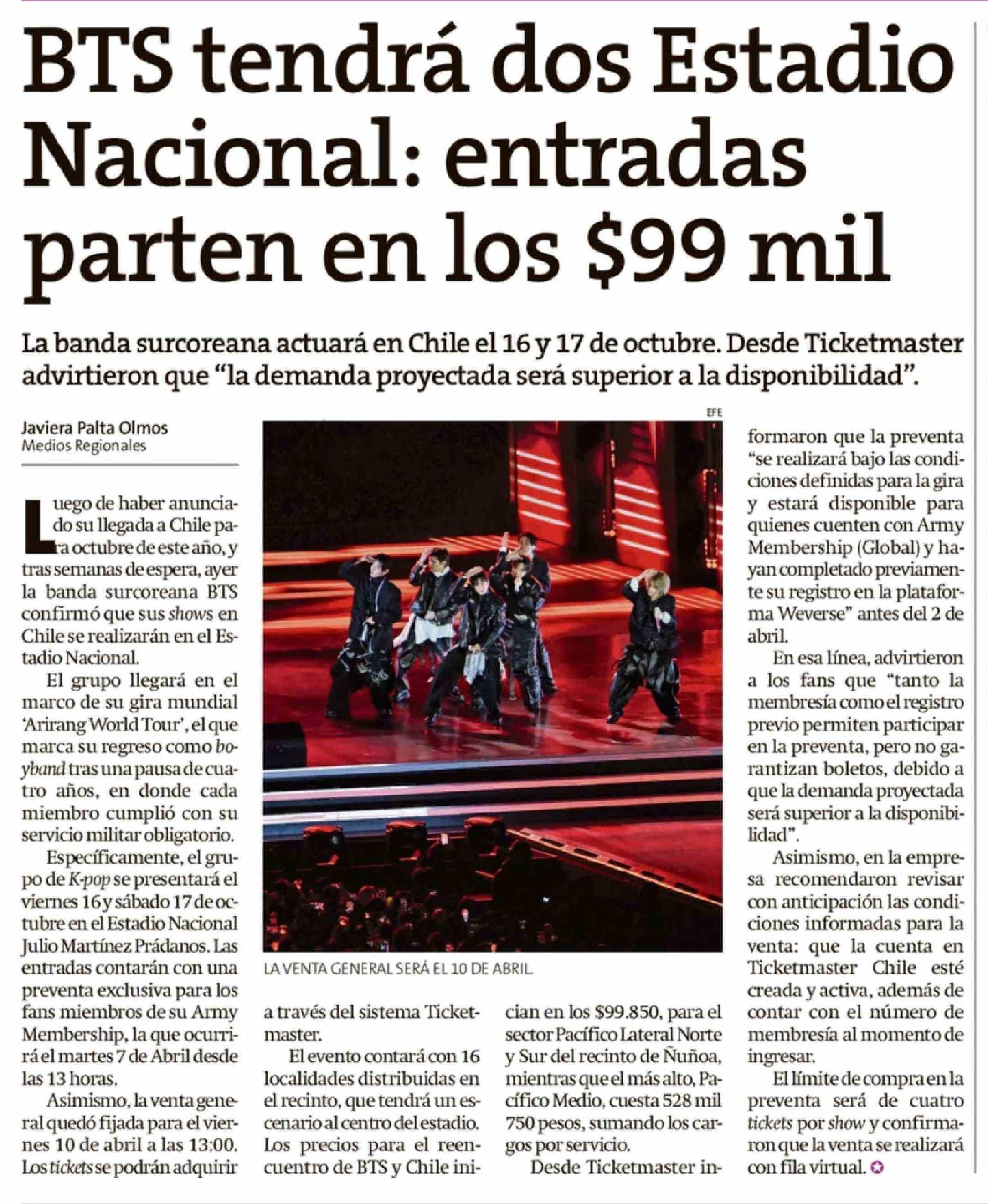 Título: BTS tendrá dos Estadio Nacional: entradas parten en los $99 mil