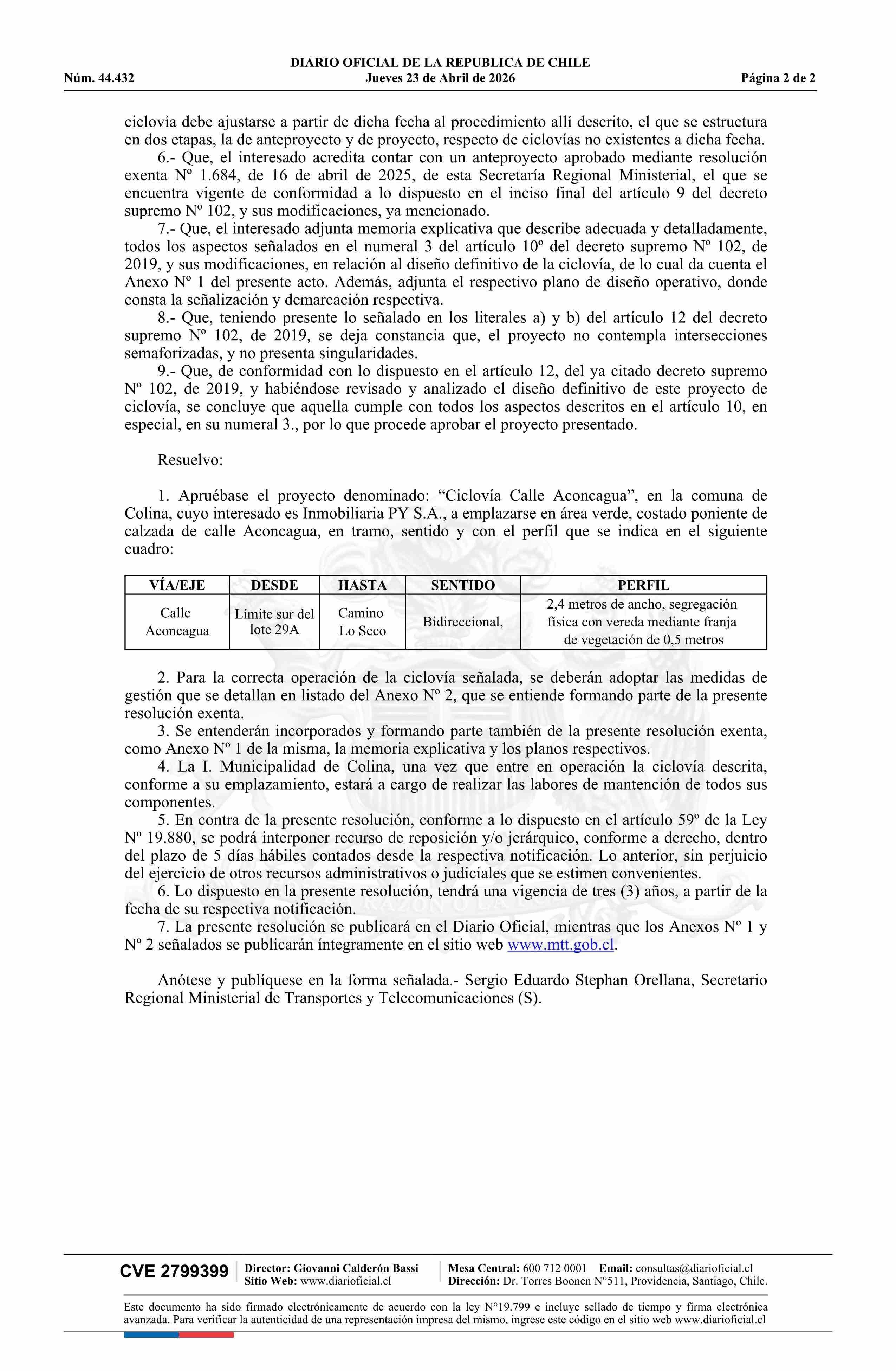 | Título: | Resolución exenta número 871, de 2026.- Aprueba proyecto de Ciclovía Calle Aconcagua, comuna de Colina |