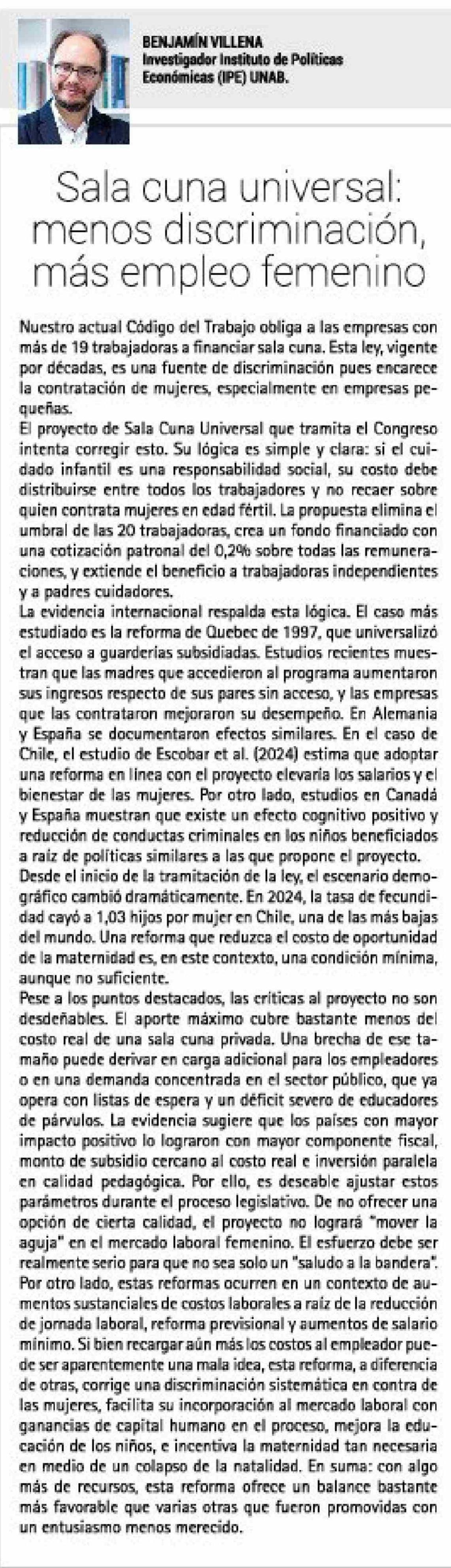 Columnas de Opinión: Sala cuna universal: menos discriminación, más empleo femenino