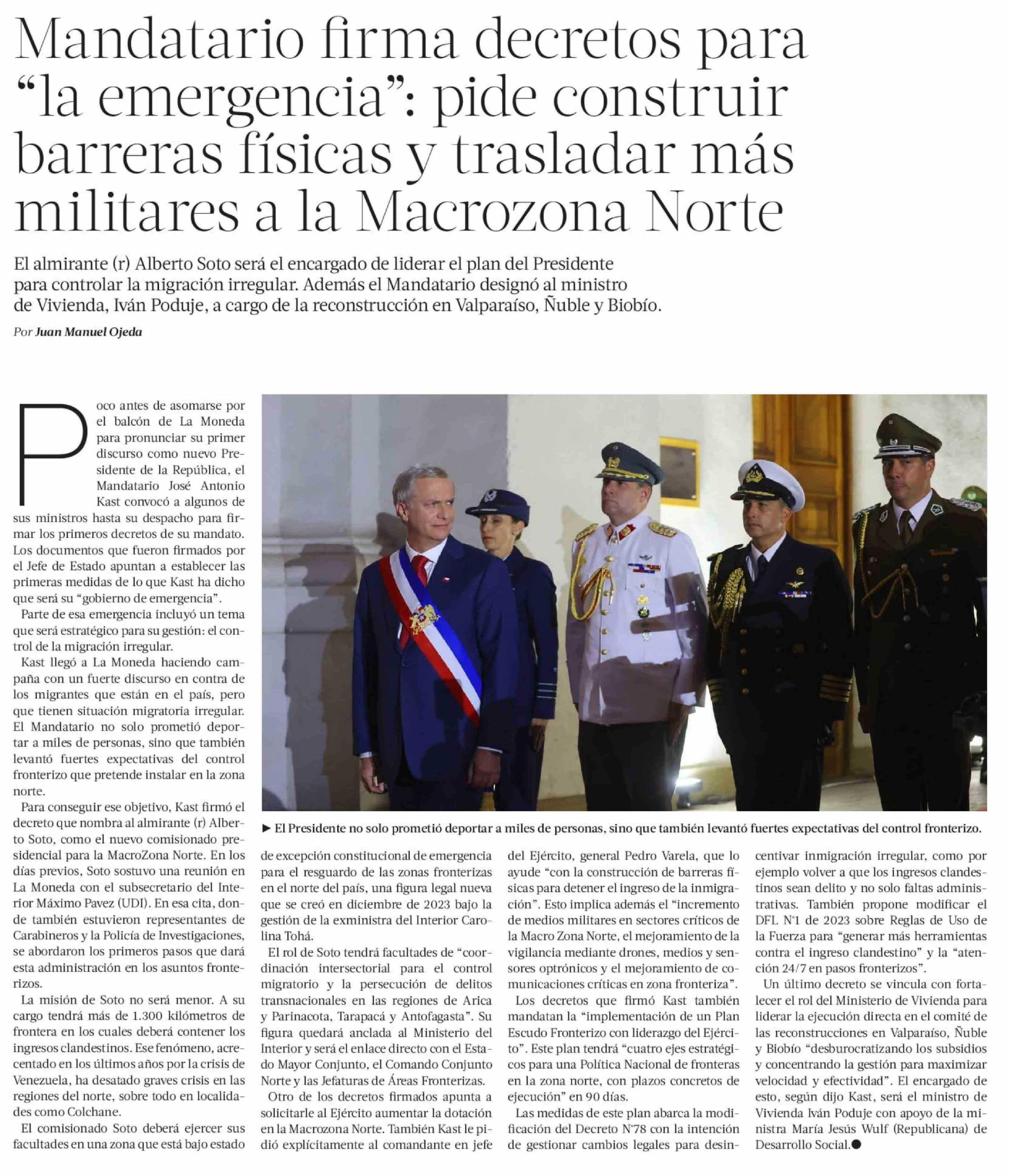 Título: Mandatario firma decretos para "la emergencia": pide construir barreras físicas y trasladar más militares a la Macrozona Norte
