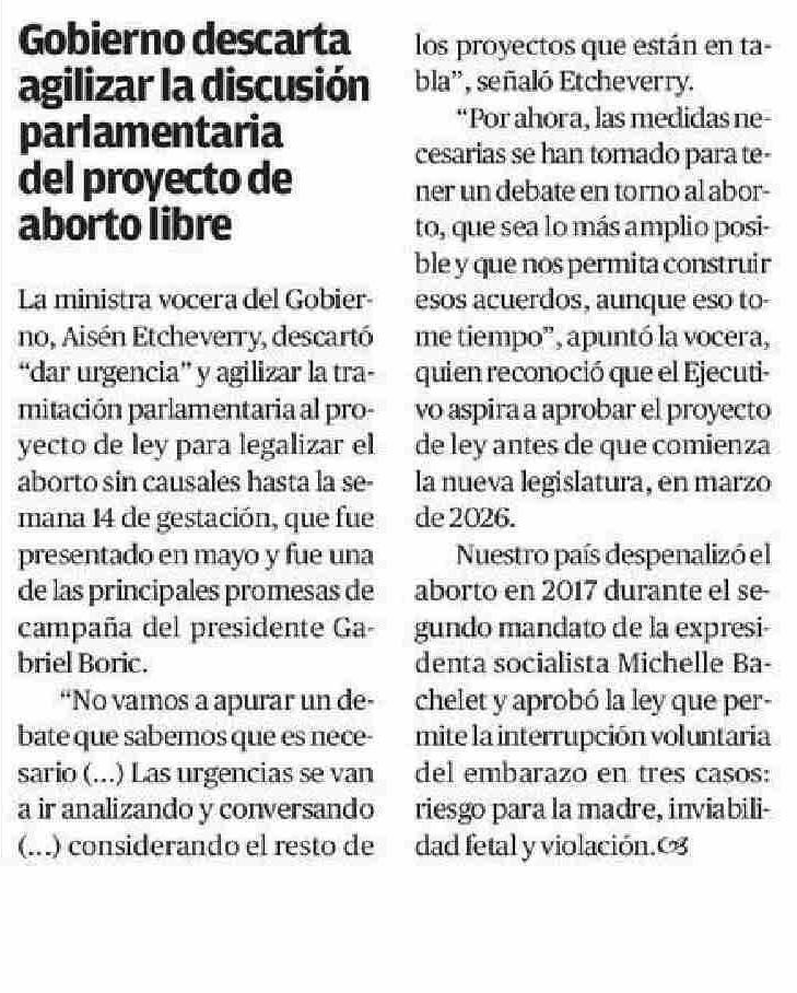 Gobierno descarta agilizar la discusión parlamentaria del proyecto de aborto libre