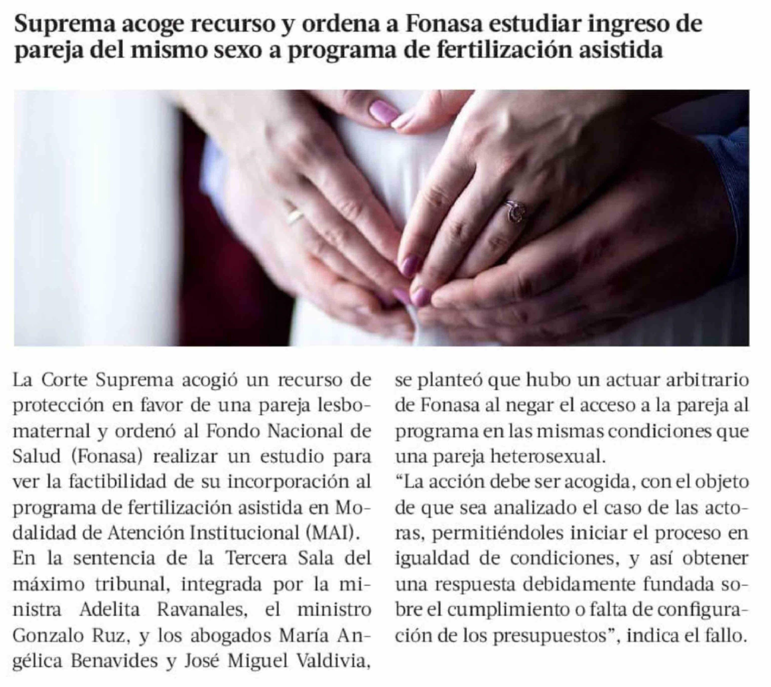 Suprema acoge recurso y ordena a Fonasa estudiar ingreso de pareja del mismo sexo a programa de fertilización asistida