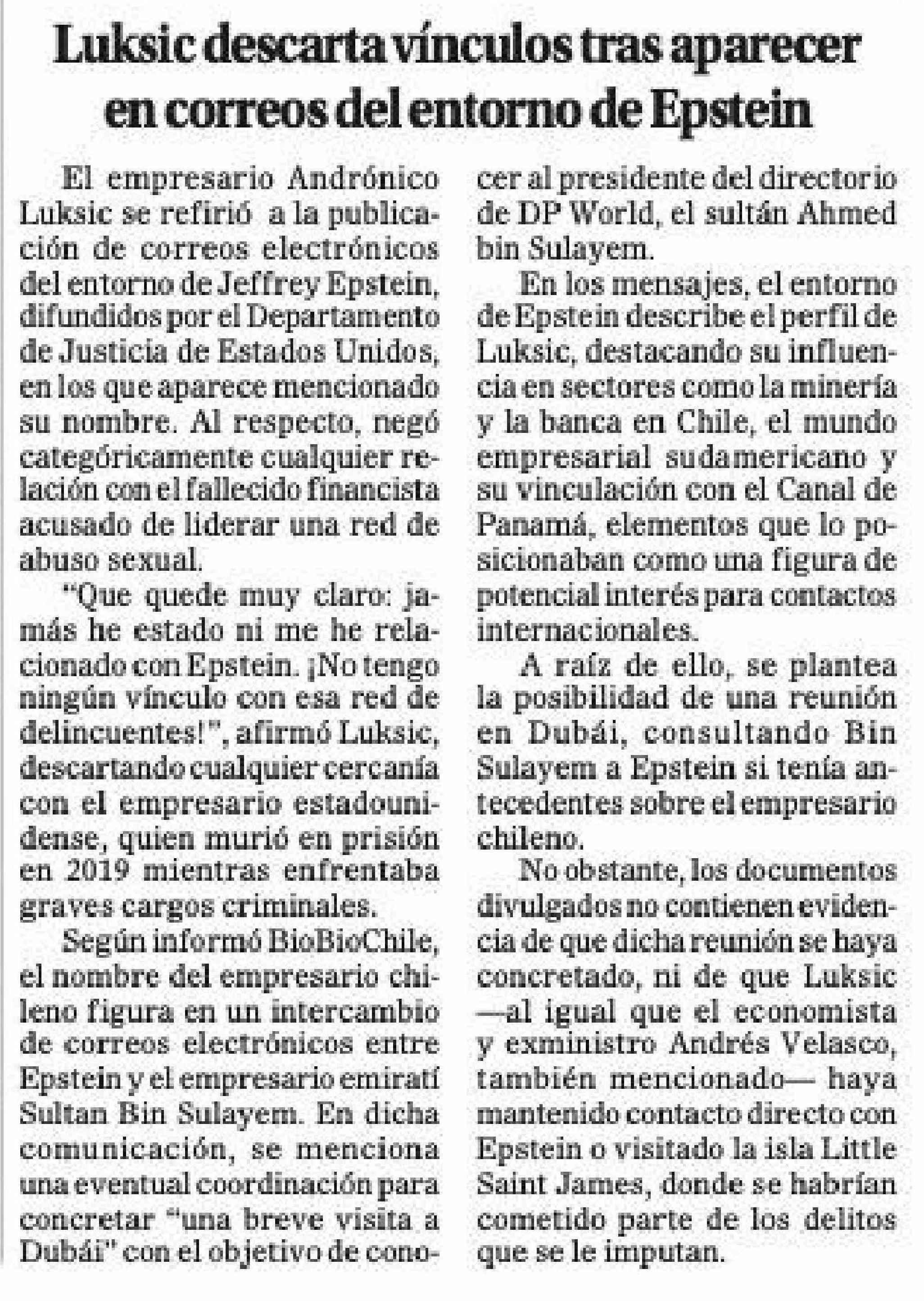 Luksic descarta vínculos tras aparecer en correos del entorno de Epstein
