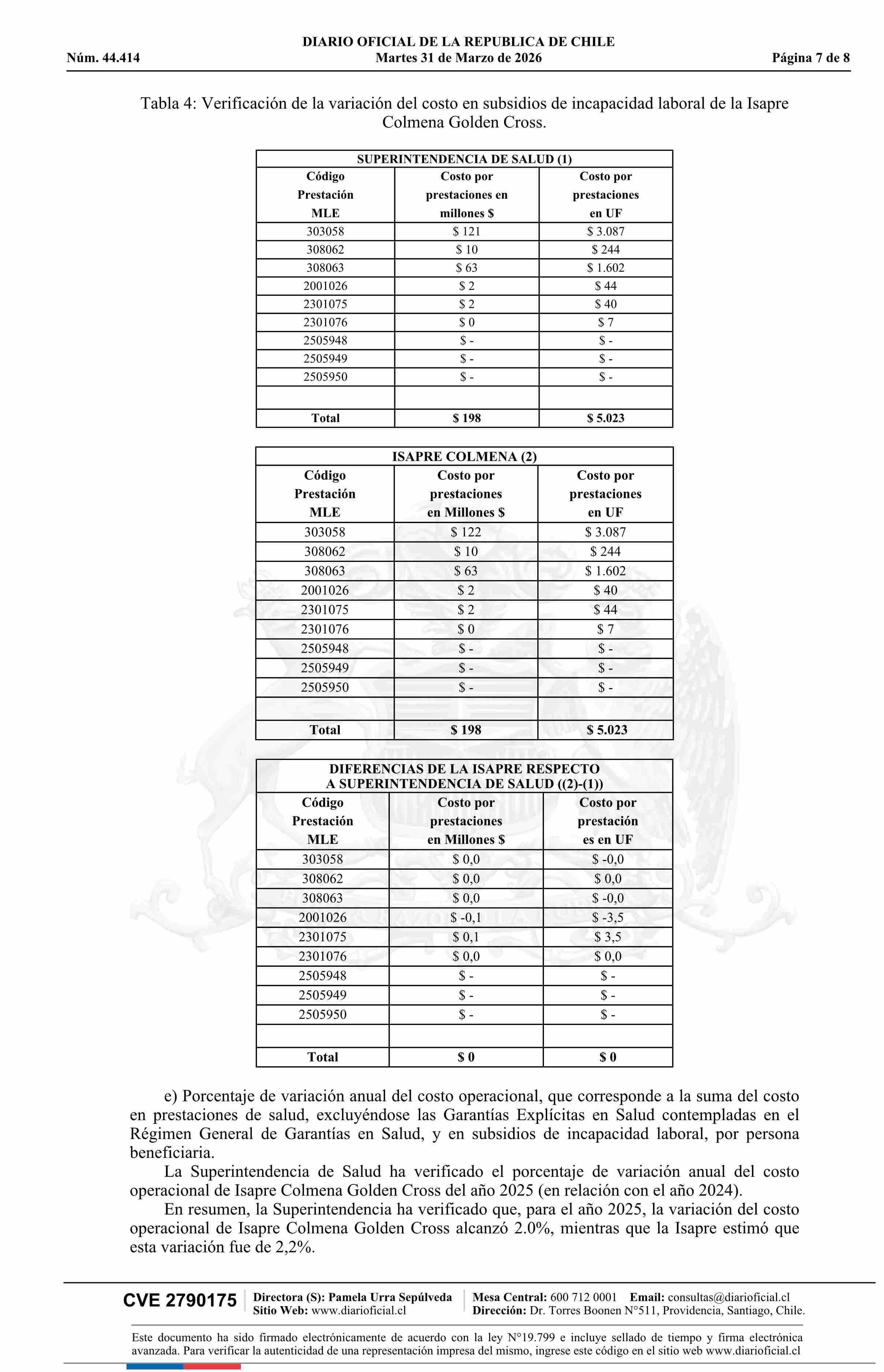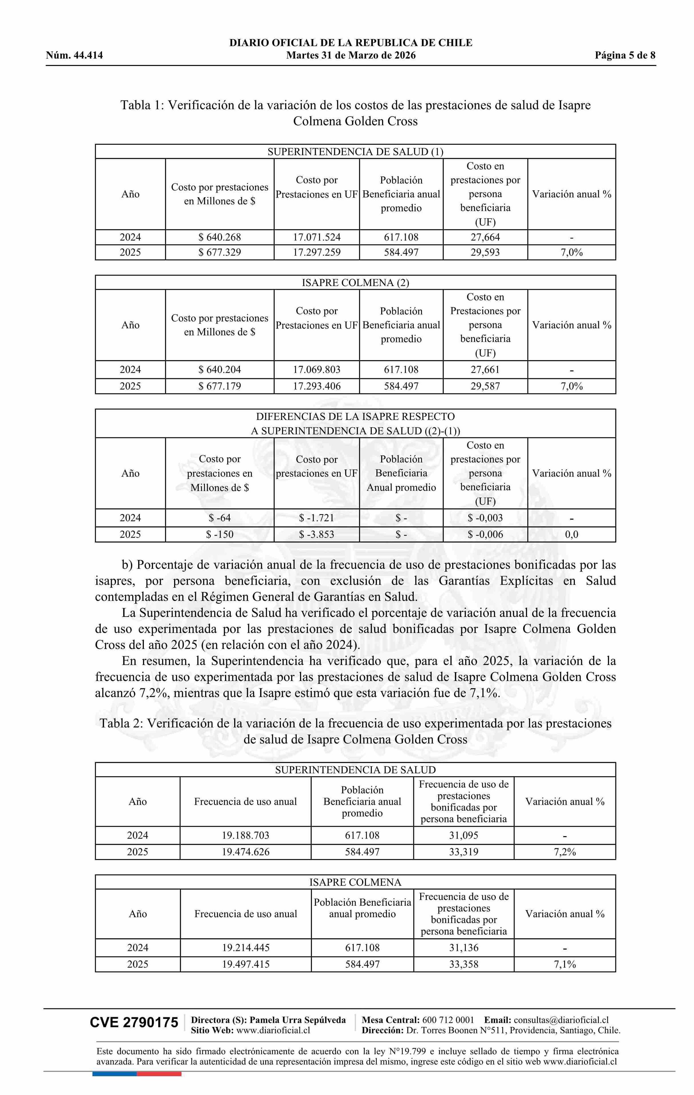 | Título: | MINISTERIO DE SALUD Superintendencia de Salud / Intendencia de Fondos y Seguros Previsionales de Salud AUTORIZA AJUSTE DE LOS PRECIOS BASE DE LOS PLANES DE SALUD DE LA ISAPRE COLMENA GOLDEN CROSS |