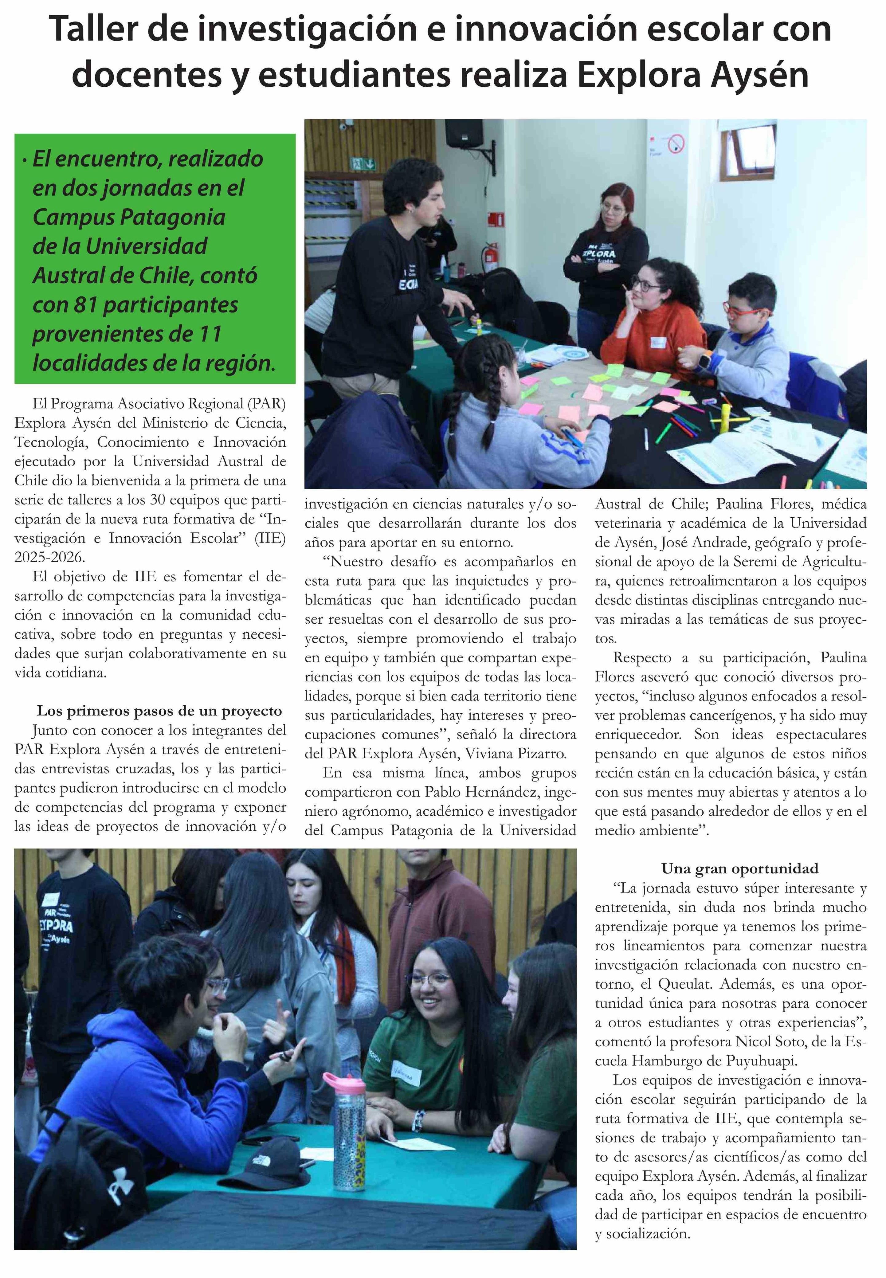 Taller de investigación e innovación escolar con docentes y estudiantes realiza Explora Aysén