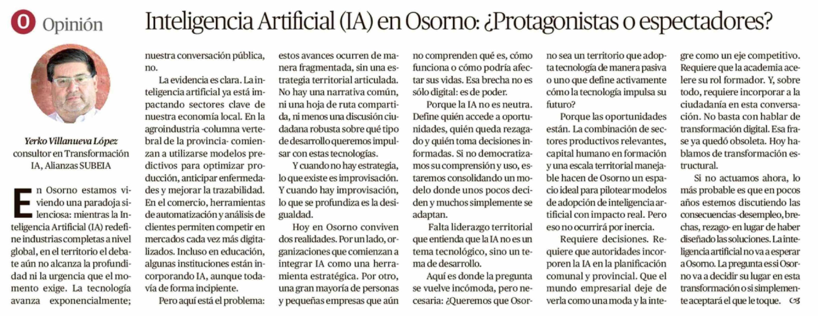 Título: Columnas de Opinión: Inteligencia Artificial (IA) en Osorno: ¿ Protagonistas o espectadores?