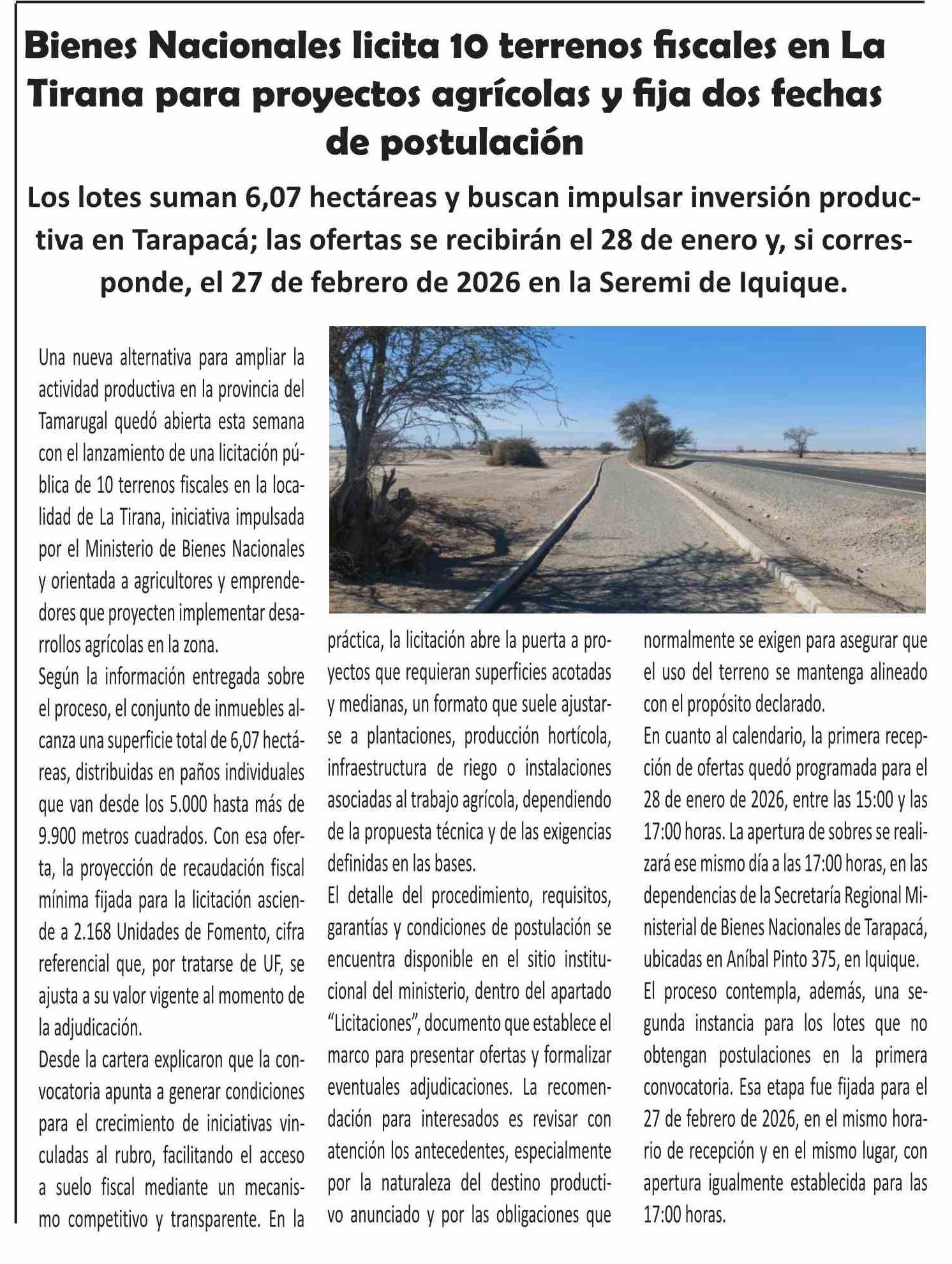 Bienes Nacionales licita 10 terrenos fiscales en La Tirana para proyectos agrícolas y fija dos fechas de postulación