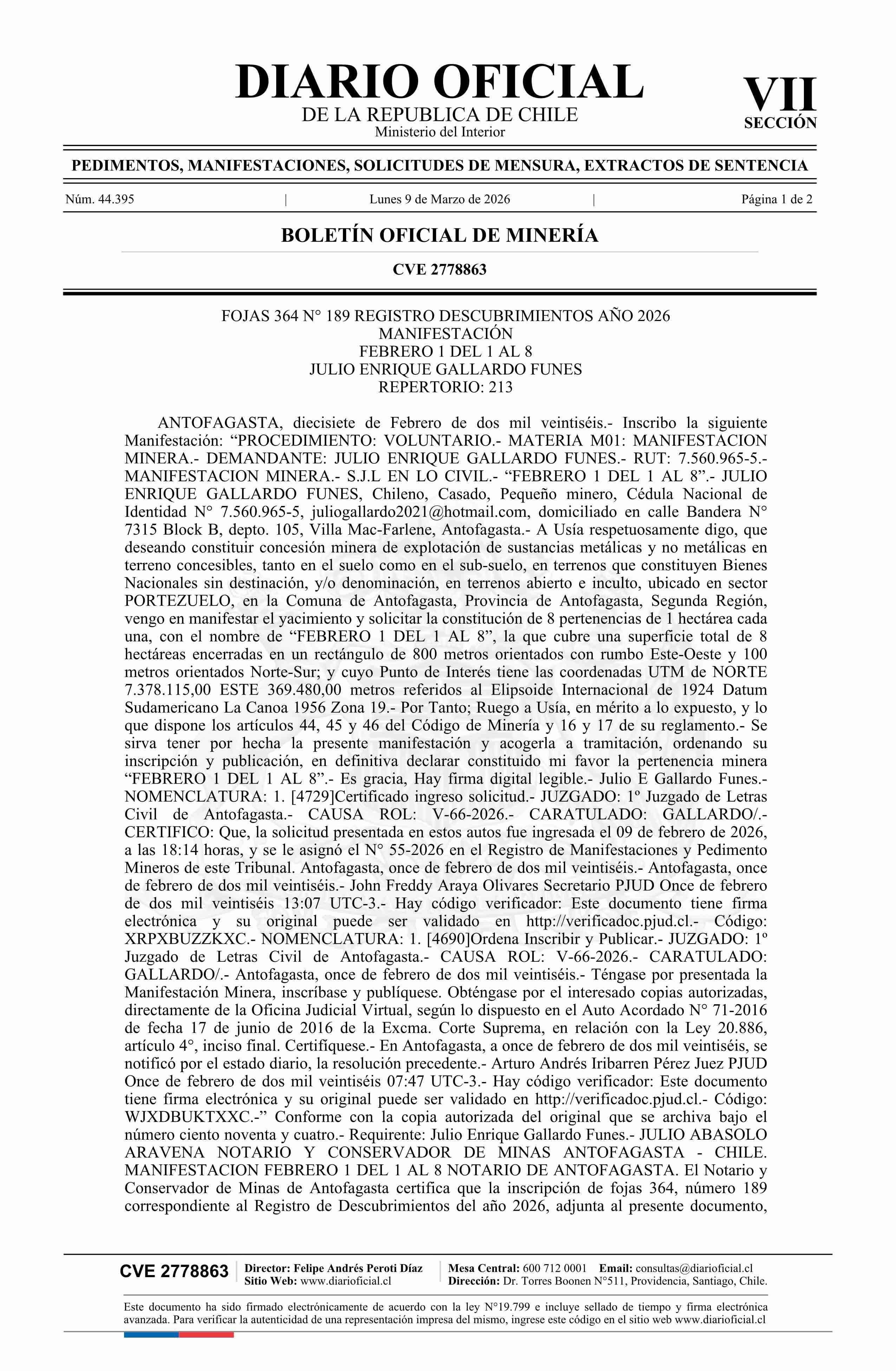 DIARIO OFICIAL CHILE - BOLETÍN OFICIAL DE MINERÍA (DIARIO OFICIAL CHILE – BOM – MANIFESTACIONES MIN)