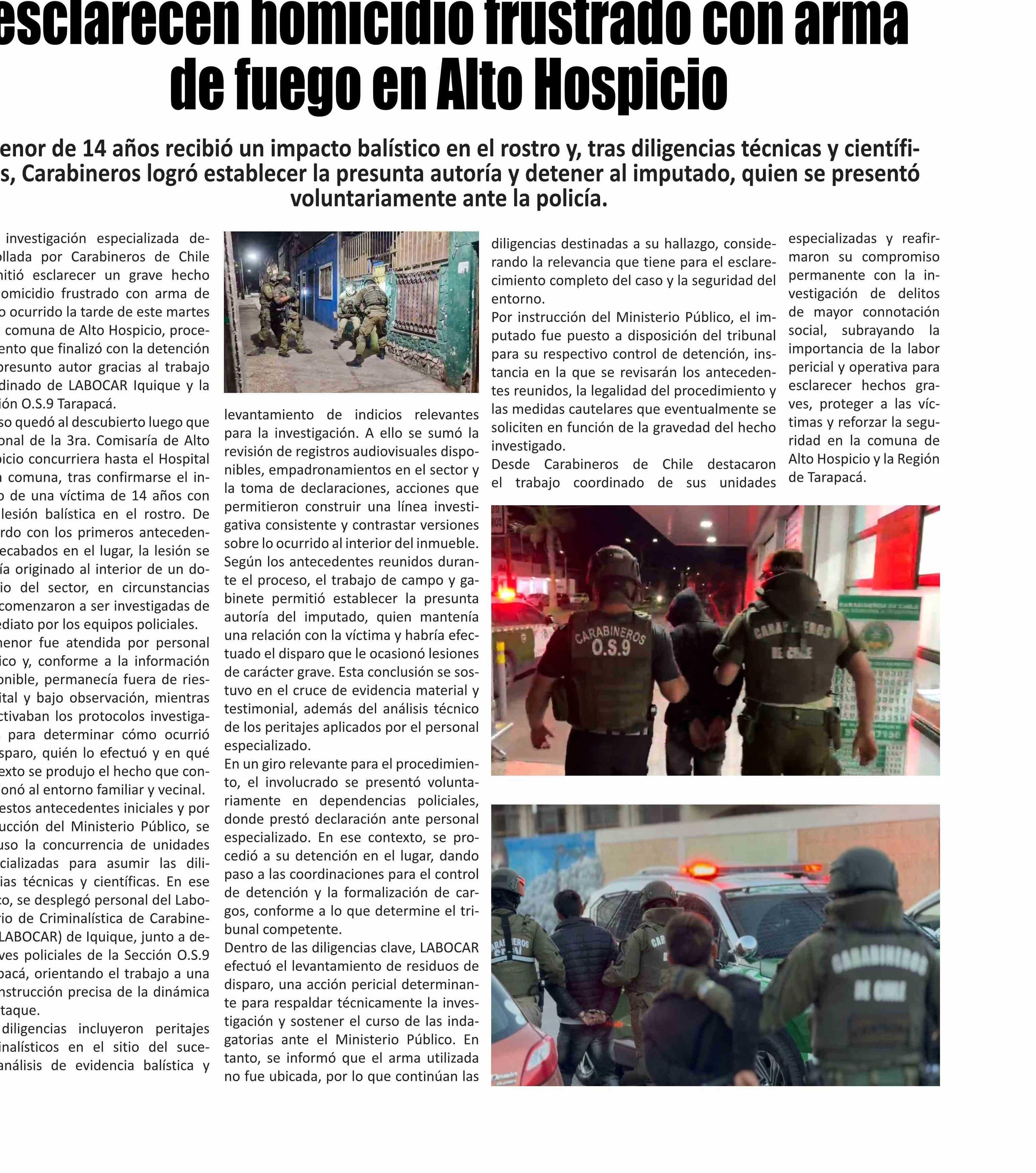 Peritajes de LABOCAR y trabajo del O.S.9 esclarecen homicidio frustrado con arma de fuego en Alto Hospicio